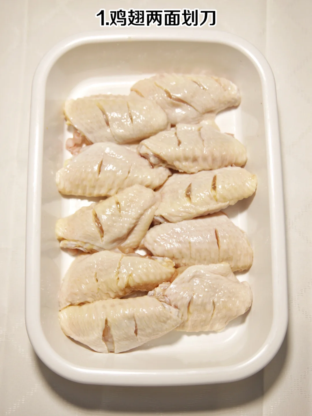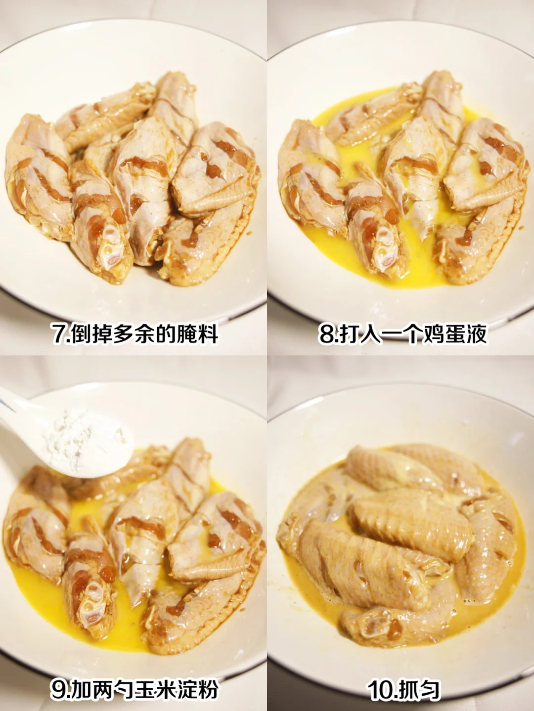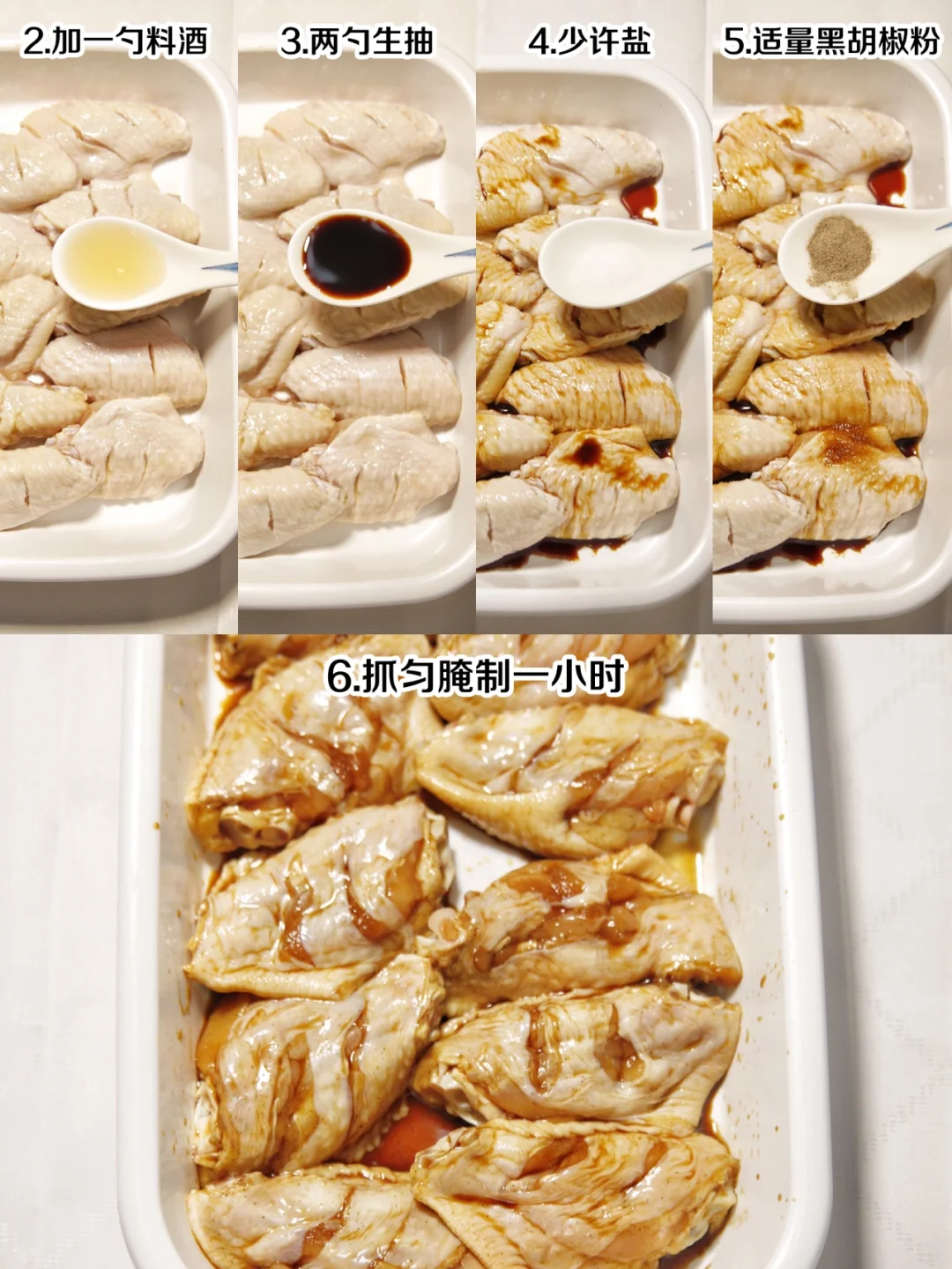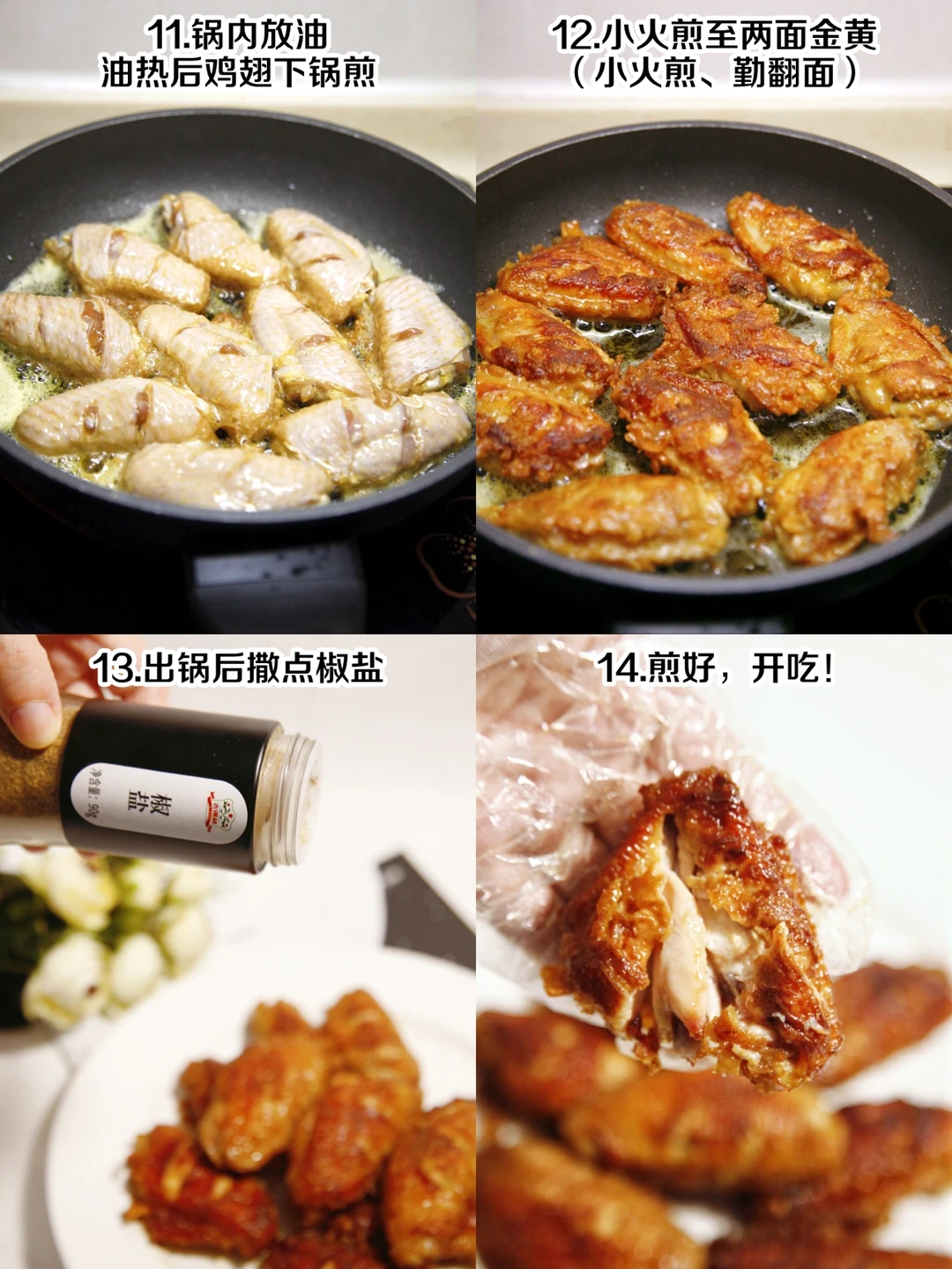 步骤🌟 1、鸡翅两面划刀 2、加一勺料酒、两勺生抽、少许盐、适量黑胡椒粉,抓匀腌制一小时 3、倒掉多余的腌料,打入一个鸡蛋液,两勺玉米淀粉抓匀 4、锅内放油,油热后鸡翅下锅煎,小火煎至两面金黄(小火煎、勤翻面) 5、出锅后撒点椒盐就可以开吃啦✌️