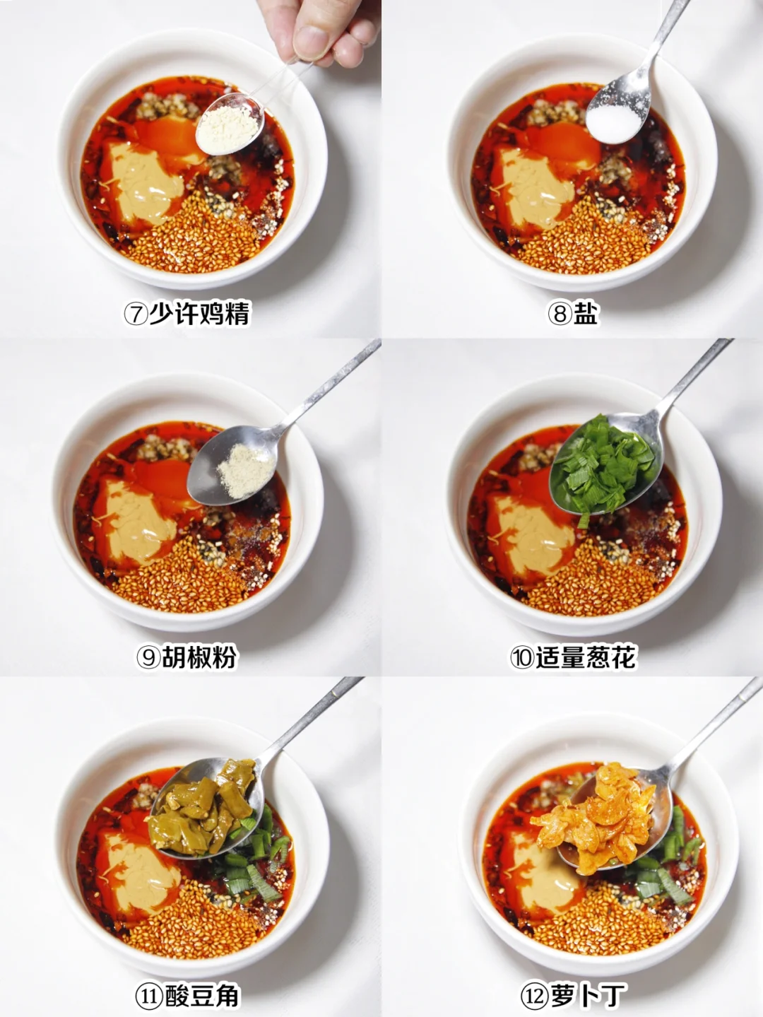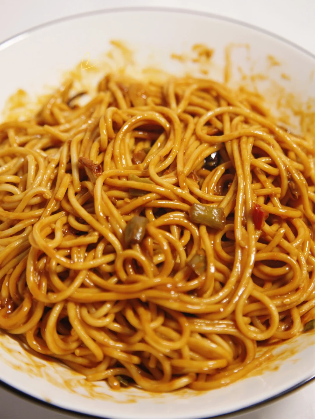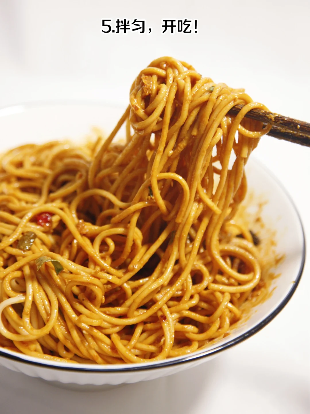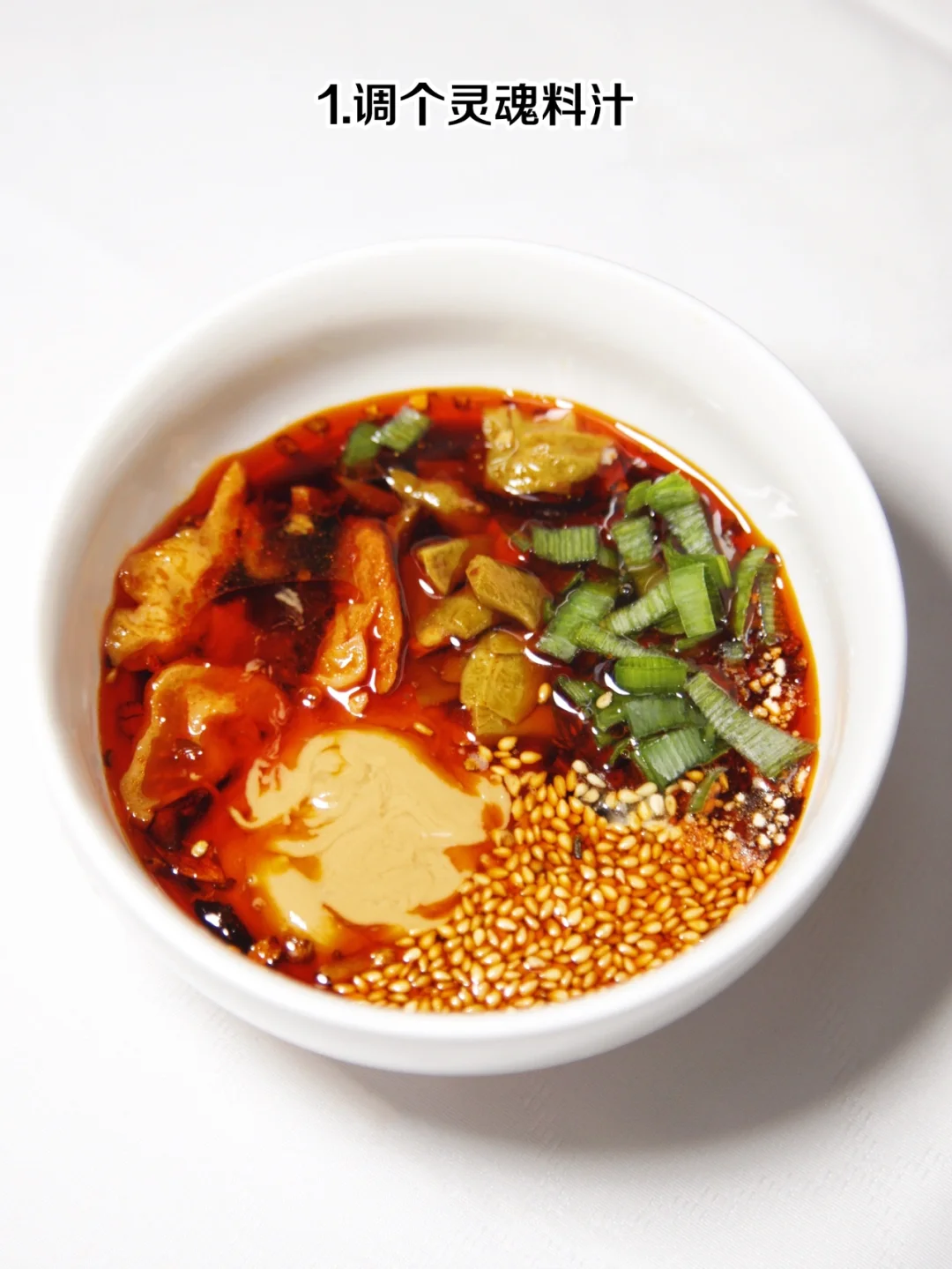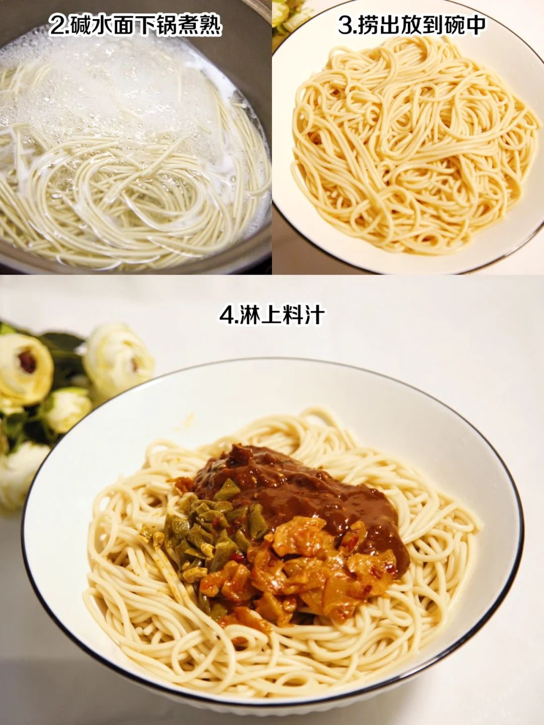 步骤🌟 1、灵魂料汁:2勺生抽、半勺老抽、2勺辣椒油、2勺蒜水、1勺白芝麻、2勺芝麻酱、少许鸡精、盐、胡椒粉,适量葱花、酸豆角、萝卜丁。 2、碱水面下锅煮熟 3、捞出放到碗中 4、淋上料汁 5、拌匀,开吃!✌️