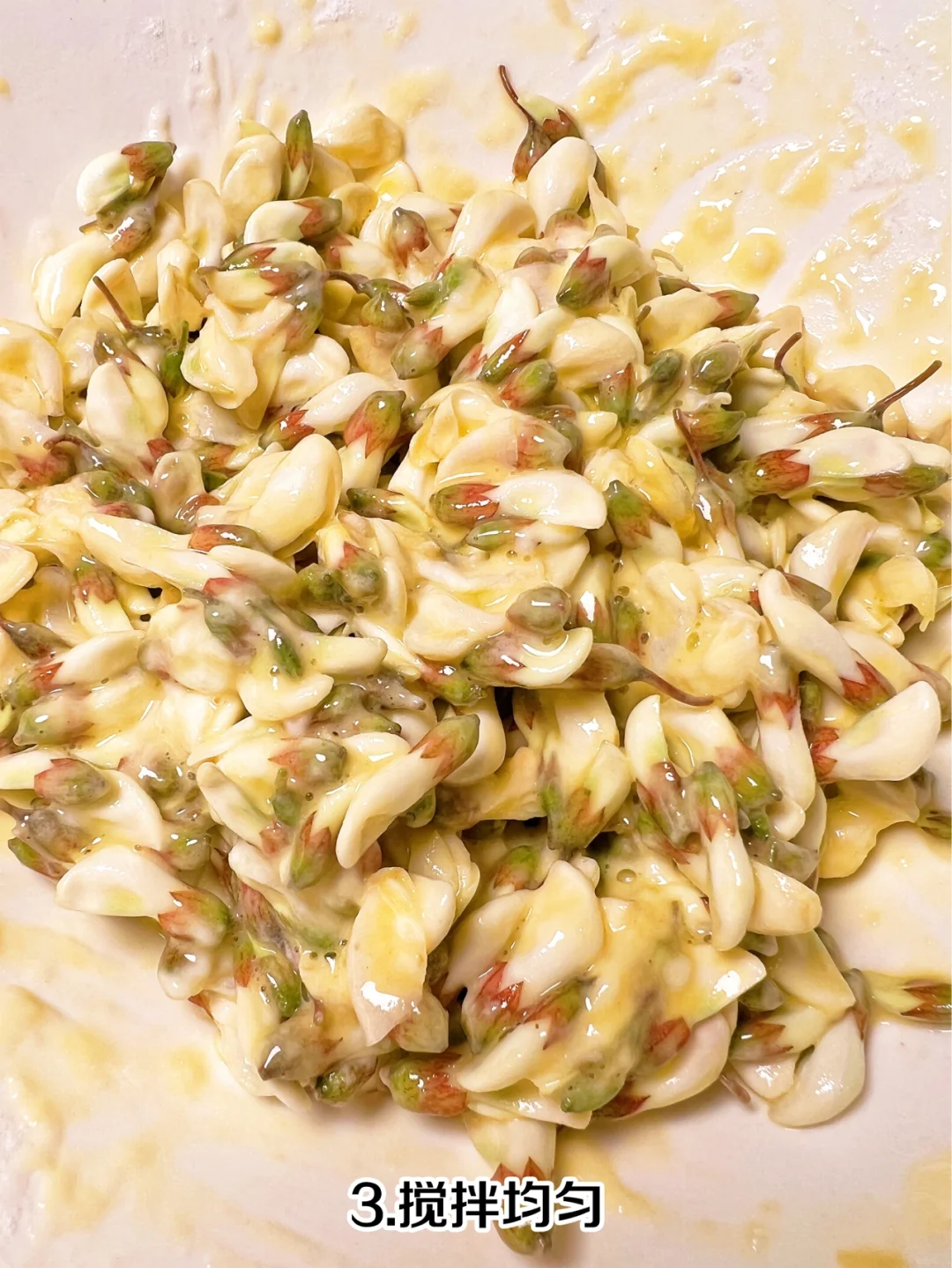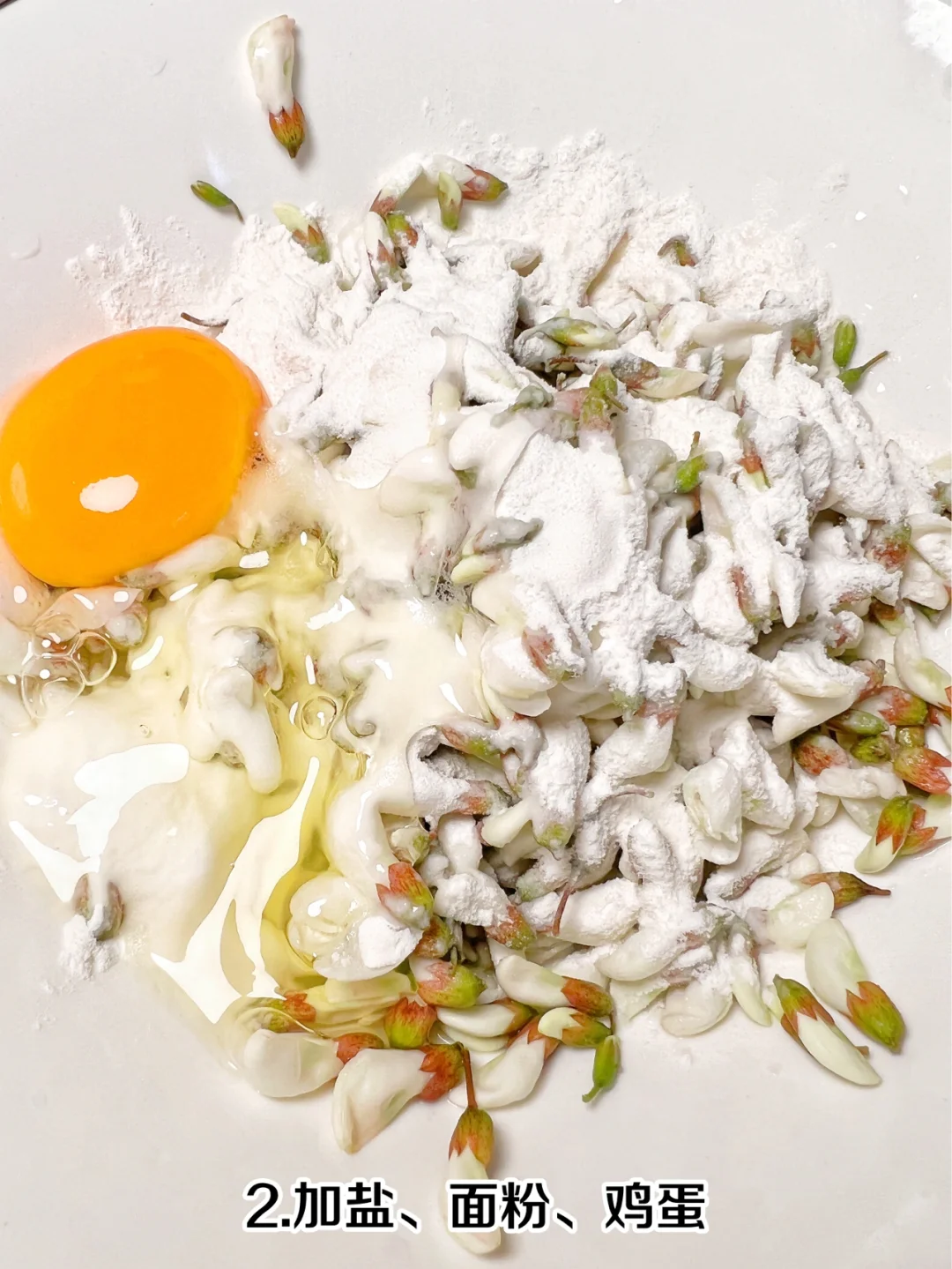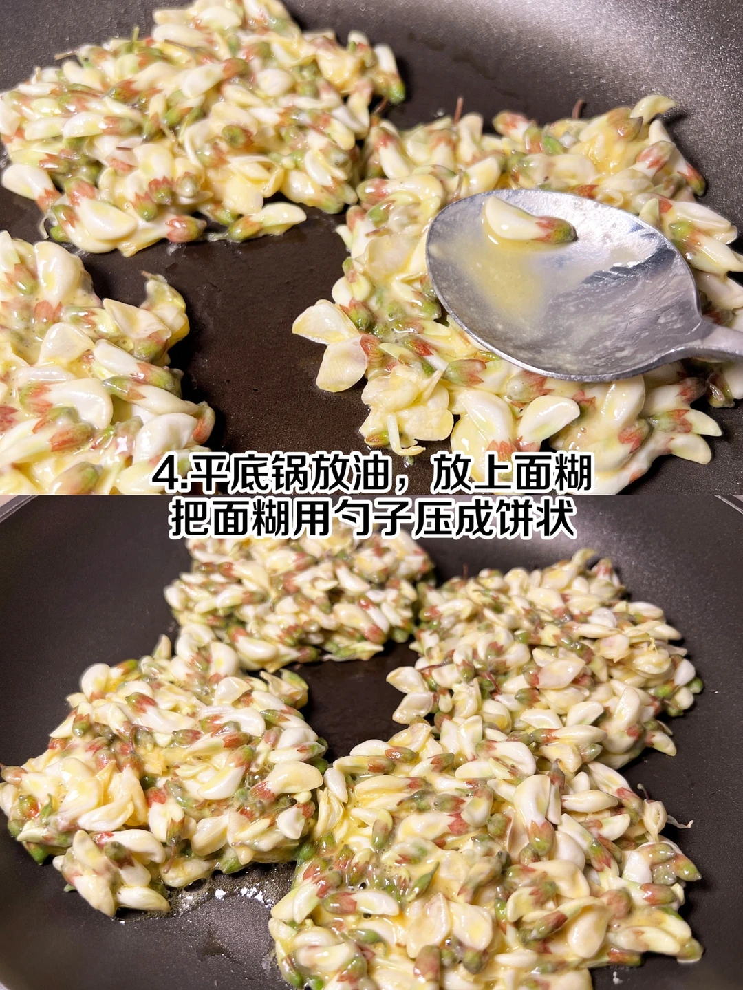 步骤: 1、洋槐花用淡盐水浸泡洗净 2、加盐、面粉、鸡蛋、搅拌均匀 3、平底锅放油,放上面糊,把面糊用勺子压成饼状 4、煎至两面金黄就OK啦!