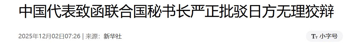中国在联合国改变对日本称呼!2025年12月1日,中国代表再次致函联合国秘书长,文中改变对日本称呼,向全体会员国散发! 近期日本首相发表了不当言行,促使中日关系急转恶化。当事件发生后,我国多次警告日本,但日方没有丝毫的悔改之意。所以我国常驻联合国代表傅聪直接致函了联合国秘书长古特雷斯,批评了日方的言行举止。 但在我国发出致函后,日方也效仿我国的行为,向联合国致函。也正因此,中日在联合国大会进行了激烈的交锋。 当日方致函联合国后,傅聪那是再次致函联合国,驳斥了日方的不当言行。在第二封的致函中更是列出了日本的“五宗罪”。 而在第二封的致函书中,最吸引人的是我国代表改变了对日本的称呼,提醒日本不要忘记“战败国”的身份。而在文章的开头,更是直接写出“奉政府指示”。 中日争端已经不是简单的台海问题,现如今的中日之间存在严重的分歧。致使这一切的是因为日本首相发表的涉台挑衅性言论,在我国多次重申台湾是中国的内政,不允许外部势力干涉的前提下。 日本首相却试图将台湾与日本挂钩,妄称“台湾有事,可能对日本构成存亡危机事态”。其言论才是最根本的原因,所以中方才会因此进行驳斥。 第二封的致函更是向全体会员国散发,而是再一次的警告其他国家,不要试图在台湾问题上挑衅中国。中国的反击从来都不是说说而已,任何的挑衅行为都最终会是自食恶果。 对此,您怎么看?关于评论区留言您的看法。 (信息来源:中国代表致函联合国秘书长严正批驳日方无理狡辩-新华社)