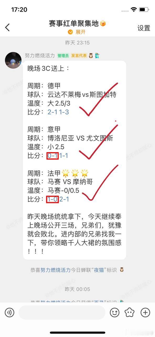昨天家里的心水三川,三场全部拿下!精准那些意甲细节01还有法甲细节10!目前我们的方向也在连红中!今晚还有精选方案推荐给兄弟们,加入的兄弟即可参考!