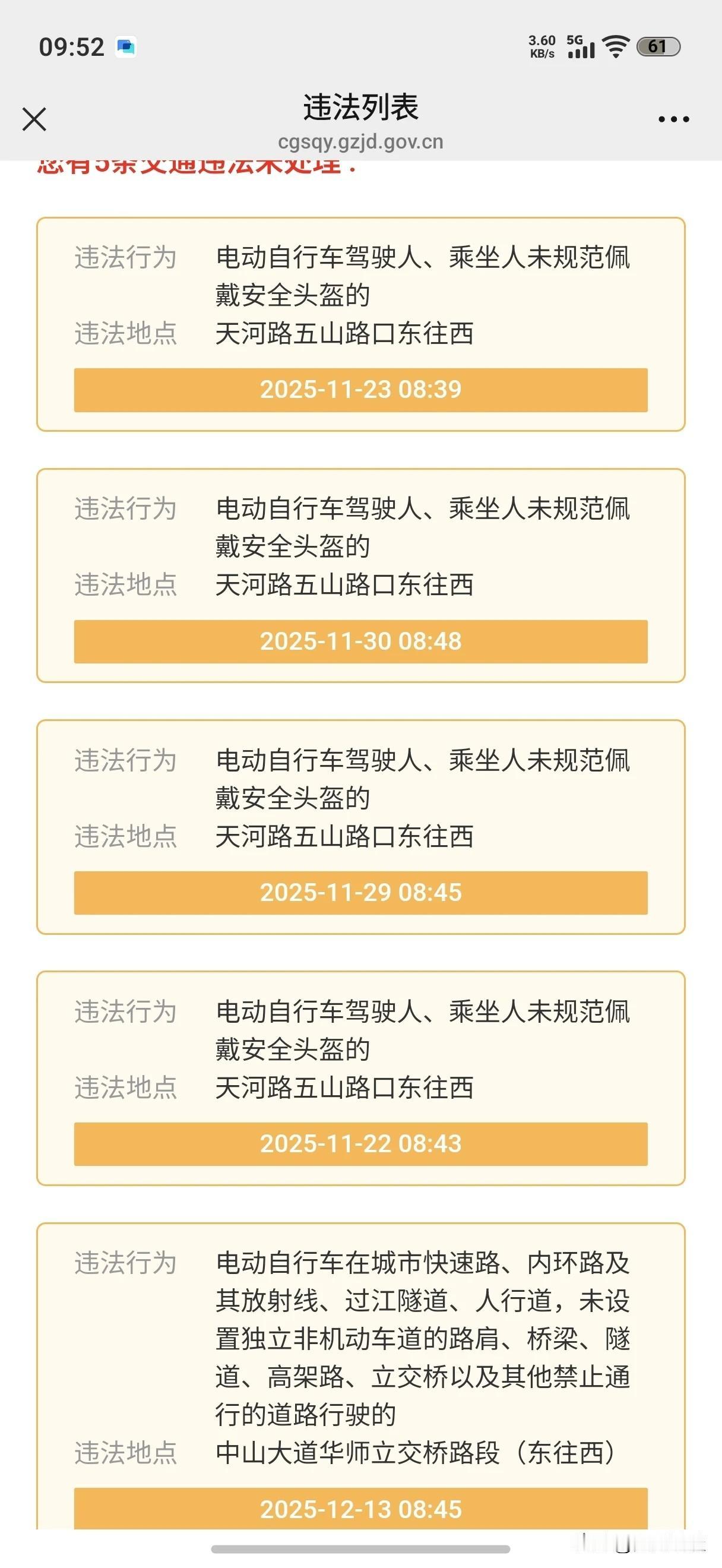 【天塌了】没有收到短信通知?为什么没有早点查查呢?骑电动车不戴头盔、走立交桥多次被拍! 不查不知道,一查吓一跳,多次被抓拍,面临扣车! 一女士骑电动车,多次被电子抓拍设备抓拍到骑车不戴头盔,走立交桥等。由于多项违法未处理,面临扣车风险! 如果下次遇到在路面被查,那就直接扣车了。广州固定电动自行车超过三条违法未处理,就要扣车了。 看到一女电动车主查到自己有多条电动自行车违法记录。 吓得我,赶紧查一下自己,还好没有! 话说了解一下常走的路段,有没有抓拍设备,还是很有必要的。 当然了,严格遵守交通规则,是一直都需要的,与是否有抓拍设备无关。 只要遵守交通规则,骑乘电动车佩戴头盔,不走机动车道,不上高架路,不进隧道,不逆行等,就不用担心被拍照了。 实际上,抓拍电动自行车违法的设备,通过RFID,目前是只能抓拍直行闯红灯的,对于右转闯红灯是无能为力的。有些路口,有右转箭头红灯,也需要遵守信号灯。