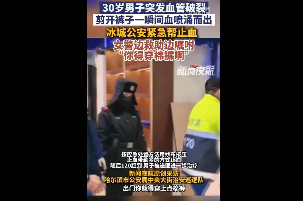 近日,黑龙江哈尔滨中央大街,一男子因未做好冬季保暖,腿部静脉曲张旧疾复发致血管破裂,出血量较大。 巡逻民警接求助后,立即呼叫警务站取急救箱,剪开其血浸湿的裤子应急处置,女警全程叮嘱保暖,随后 120 将男子送医,网友热议北方严寒需重视防护。 先戳个人健康意识的 “糊涂账”! 明知自己有静脉曲张,还在哈尔滨零下几十度的天 “硬扛” 不穿棉裤,这哪是 “抗冻”? 分明是拿身体当赌注! 之前就出过血还不吸取教训,总觉得 “冷一会儿没事”,这种侥幸心理,在北方冬天就是 “玩命”—— 血管冻裂可不是小伤,真延误救治可能截肢,甚至危及生命。 再说说南北冷的 “本质差”:南方冷是湿冷 “钻骨头”,顶多冻得难受;北方冷是干冷 “冻透肉”,能直接让血管收缩破裂,是实打实的 “物理伤害”。 可总有南方朋友来北方高估自己的抗冻力,或北方人觉得 “从小冻大不怕冷”,忽视保暖,这都是拿健康开玩笑。 更该夸基层民警的 “应急力”:没等 120 时先剪开血裤子处置,还不忘叮嘱穿棉裤,既救急又暖心。 这事儿也暴露冬季公共健康的 “盲区”—— 街边能不能多设些临时取暖点? 社区能不能给有基础病的居民发保暖提醒? 最后得说,冬季保暖从不是 “小事”,尤其是对老人、有基础病的人,每一次 “装犊子” 不穿暖,都可能埋下健康隐患。 说到底,我们在极端天气面前,别逞能,保命比 “耍酷” 重要多了!