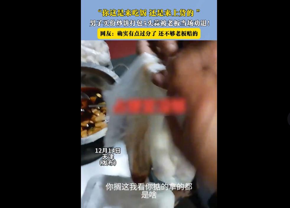 12 月 15 日天津,一男子买炒饼时要打包 5 头蒜、咸菜和辣椒,被老板劝退。 网友称其过分,5 头蒜约半斤值 3-4 元,炒饼利润薄,这般索取像 “进货”。 从消费观念看,部分人仍带着 “免费就该多拿” 的旧思维 —— 觉得商家配料 “不值钱”,却忽略物价上涨下的成本变化。 过去大蒜 1 元 / 斤时多拿几头无妨,如今市价翻十倍,还按老习惯 “囤货”,本质是对商品价值的认知脱节,把商家的让利当成了 “必享福利”。 再看小本生意的生存困境:炒饼单价多在 10-15 元,除去面粉、油、人工成本,纯利润本就微薄。 遇到 “5 头蒜 + 咸菜 + 辣椒” 的索取,相当于白做一单甚至倒贴,老板劝退不是 “小气”,而是为了保住基本利润。 比起连锁餐厅,街边小店抗风险能力弱,对成本变动更敏感,消费者若忽视这点,实则是挤压小商户的生存空间。 地域饮食文化的边界也值得深思:北方 “吃面食配蒜” 是传统,但 “配” 的核心是 “搭配食用”,而非 “打包带走”。 就像陕西人吃凉皮配蒜水,没人会要求把整碗蒜水打包,这种 “适度” 的默契,是地域饮食文化里的隐性规则。 男子的行为打破了这份默契,让 “饮食习惯” 变成了 “过度索取”。 更隐性的是社会信任成本的损耗:老板若妥协一次,可能会有更多人效仿 “多拿配料”,后续不得不设置更严格的限制;消费者被劝退,也可能觉得商家 “不近人情”。 一次小纠纷,悄悄拉远了买卖双方的信任距离,而市井交易的温暖,恰恰需要 “不贪小利、不苛责对方” 的信任来支撑。