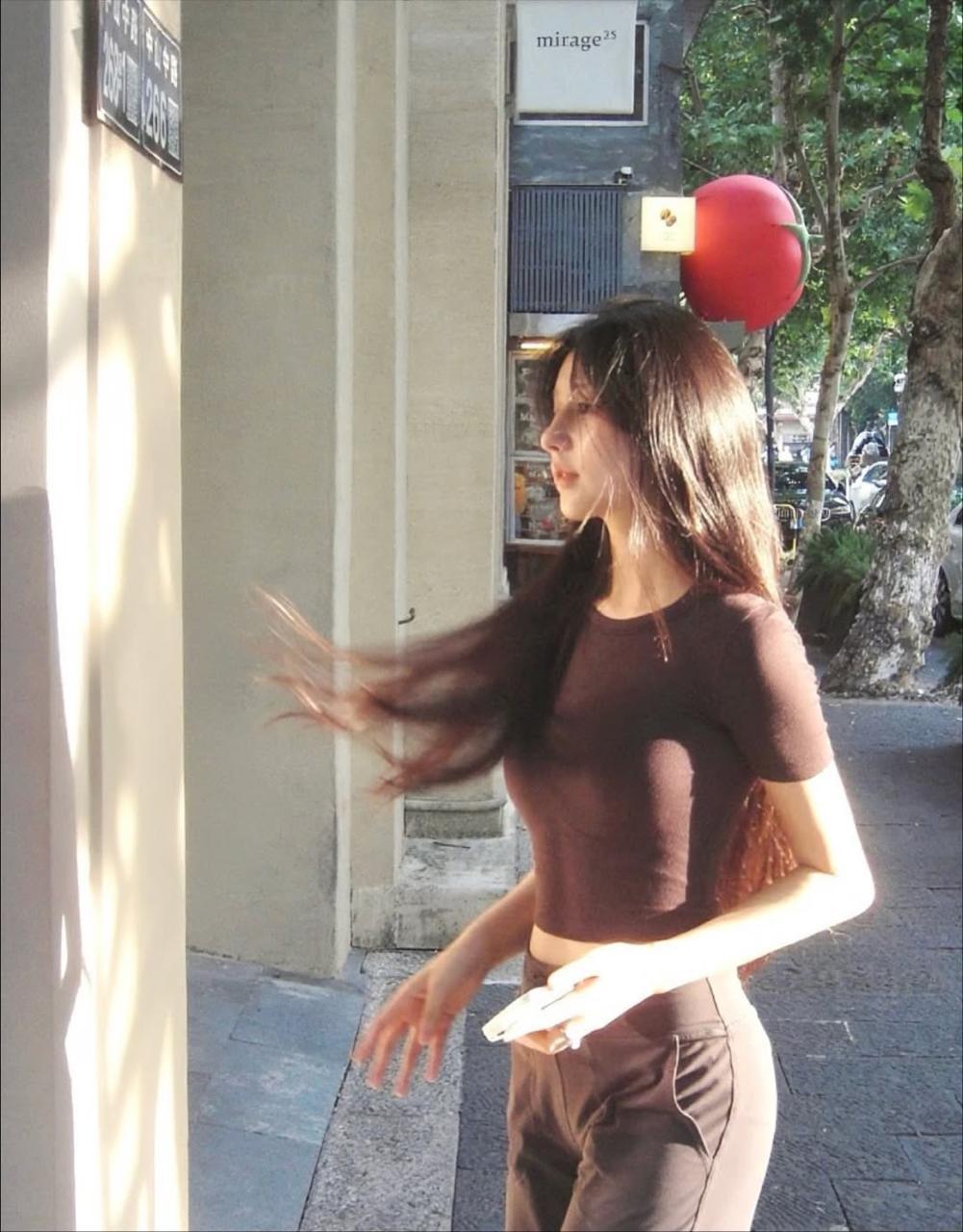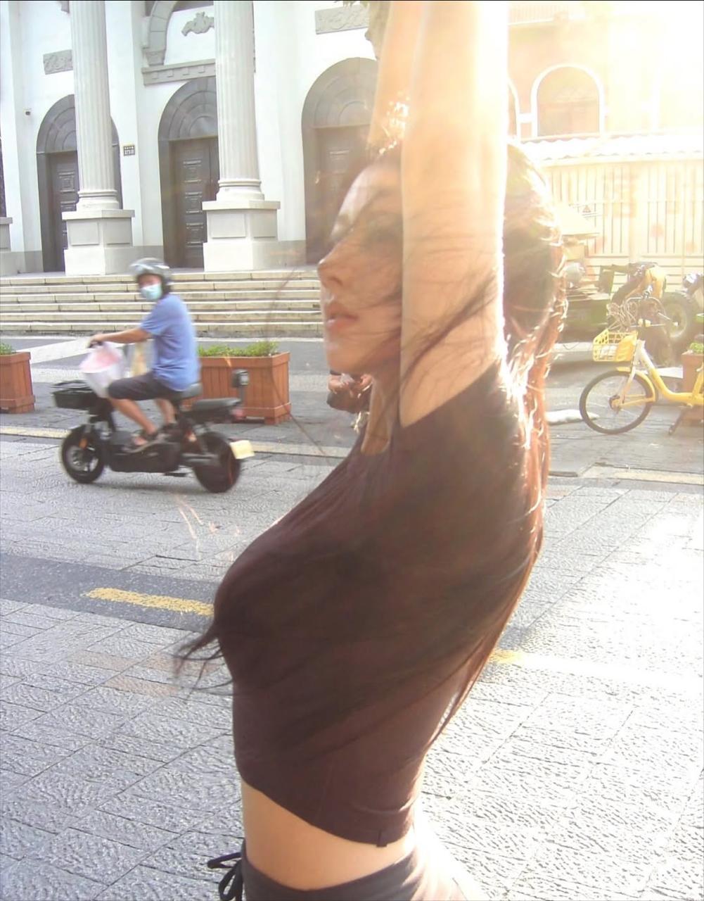 阳光为她的轮廓镀上柔金,飞扬的发丝在风中奏响自由的旋律。她双臂高举,舒展的姿态里藏着蓬勃生命力。紧身的深色露脐上衣勾勒出流畅的身形曲线,举手投足间,是青春的活力与自信。背景里,城市的喧嚣与她的灵动形成奇妙的和谐,仿佛将平凡街角点染成充满生命力的舞台。