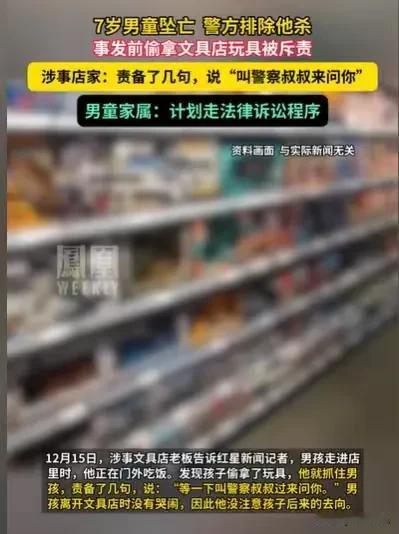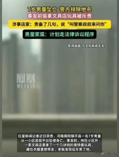 河南南阳,7岁男孩,偷偷将一个几元钱的玩具,塞入衣服中,店主发现之后,就指责了他几句,还说让民警过来问他,男孩放下玩具,就走向小区的1栋楼顶,从上面一跃而下,离世了,家长觉得孩子的悲剧是店主造成,是店主说话太重了,就以威胁他人人身安全为由,追究店主的责任。 事情发生在11月21日的晚上,当时,孙先生和妻子并没有在家,他的儿子在家里,有爷爷和奶奶照顾,他们都比较放心。 儿子吃过晚饭之后,就一个人来到小区的儿童乐园玩,玩着玩着他就不想玩了,他一个人来到了小区外的一家小店。 当时店主正在外面吃饭,店主也是认识这个孩子的,平时这个孩子经常和爷爷来这家店。 店主看着孩子进去倒也没说什么,他以为孩子可能是想进来买些东西。 他没想到,孩子并没有带钱过来,在店里待了九分钟这样,就看中了一个玩具,孩子毕竟还小,他也没有考虑到爷爷没有跟他下来,没人给他付钱。 于是他就偷偷地把玩具藏到衣服里,这一幕被店主看到了,平时这孩子都是跟着爷爷来的,可能孩子已经习惯了,想要什么东西,都有爷爷付款,所以拿东西都习以为常了。 但孩子这行为是偷,店主也是看孩子还小,养成这习惯很不好,当时就指责了他几句,并且不经意地说了一句:“叫民警叔叔过来问你!” 店主没想到,就因为这一句话,他惹上了大麻烦。 这个男孩被责骂之后,就默默地将玩具拿出来放下,就一个人走了。 店主也没有将这件事放在心上,毕竟孩子还小,孩子偷东西,他指责几句也是正常的,就算是自己的孩子偷东西,也同样会被这样指责。 谁都没有想到,男孩被指责之后,居然一个人就跑到一个小区的楼顶,毫不犹豫地从楼顶一跃而下,失去了生命。 孙先生一家人得到这个噩耗,他们一家人都悲伤不已,孩子才七岁,他们把孩子捧在手里,疼爱了七年,孩子居然是以这种方式离开了他们,他们难以承受这样的痛苦。 他们当然知道孩子为何要做出这样的决定,当他们知道孩子出事之前,在文具店被店主威胁过,他们就知道孩子的离去,与店主的威胁,有不可推脱的干系,他们要追究店主的责任。 孙先生说,孩子还那么小,他不是有意要偷东西的,只是平常时和爷爷来这家店买东西,早就习惯了他拿东西,爷爷付钱,这一次小孩肯定也是认为,自己拿了东西,店主就会问他的爷爷要钱,所以他这样拿东西并不算是偷。 但是店主却因为这样,不但指责他的儿子,还要报警,说让民警过来问他,他觉得店主说话过重了,就是因为店主威胁他儿子,所以他的儿子才会遭遇不幸。 如果店主当时和他们家人好好沟通,让家人来解决这件事情,孩子就不会做出这样的事,所以他们觉得店主有很大的责任。 为此孙先生报了警,可怜的店主就这样被民警询问,民警了解了整件事情的经过,他们认为店主并没有违法事实。 在当时的情况下,他的东西被孩子偷,作为正常人都会指责孩子,说要报警的这些话,也是再正常不过的,所以店主没有违法事实,不予立案。 当孙先生得到这样的结果,他难以接受,他始终无法接受孩子离去的事实,更无法接受,店主居然不用为此事承担半点责任。 这件事在他们一家人看来,店主就是说话太重了,让孩子承受不了,所以孩子才会做出伤害自己的行为,结束自己的生命。 才七岁的孩子,在他们的内心世界,或许认为叫民警叔叔,那就是自己犯了很大的过错,所以孩子才会想不通。 如今他们一家人承受着失去孩子的痛苦, 店主却没有半点责任,孙先生要为儿子讨一个公道,他决定走法律程序,追究店主的责任。 那么发生这样的事情,店主到底有没有责任呢? 首先,要认定店主有没有责任,则要看店主有没有过错。 《民法典》第1165条规定:行为人因过错侵害他人民事权益造成损害的,应当承担侵权责任。 在这件事当中,小孩偷玩具,店主只是出于保护自己的财产,所以指责孩子,他所说的话也是在合理的范围内,并非有意要恐吓孩子,所以店主没有过错,他不需要承担责任。 其次,孩子才七岁,孙先生一家并没有看管好孩子,这么大的孩子,应当在监护人的视野范围内活动,并且对孩子要进行教导,告诉孩子不可以做偷盗之事。 孩子确实有偷盗的行为,店主保护自己的财产,指责孩子,这是人之常情,并非有恐吓的意思在里边。 所以大多数人认为店主是没有责任的,责任在于监护人,没有对孩子进行监护责任。 那么你觉得店主有责任吗?