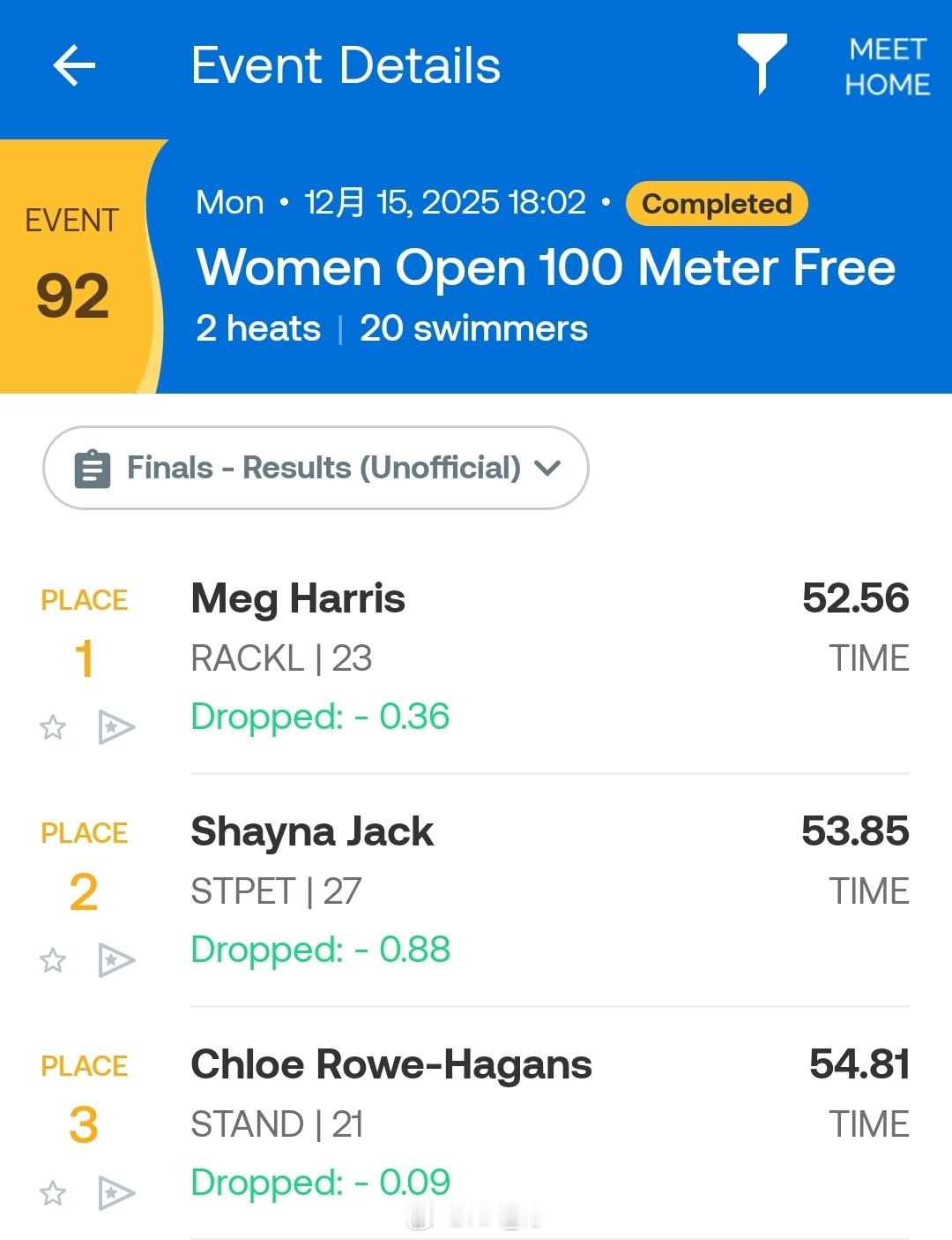 昆士兰州游泳锦标赛 女100自预赛Meg Harris 52.92看看决赛成绩?