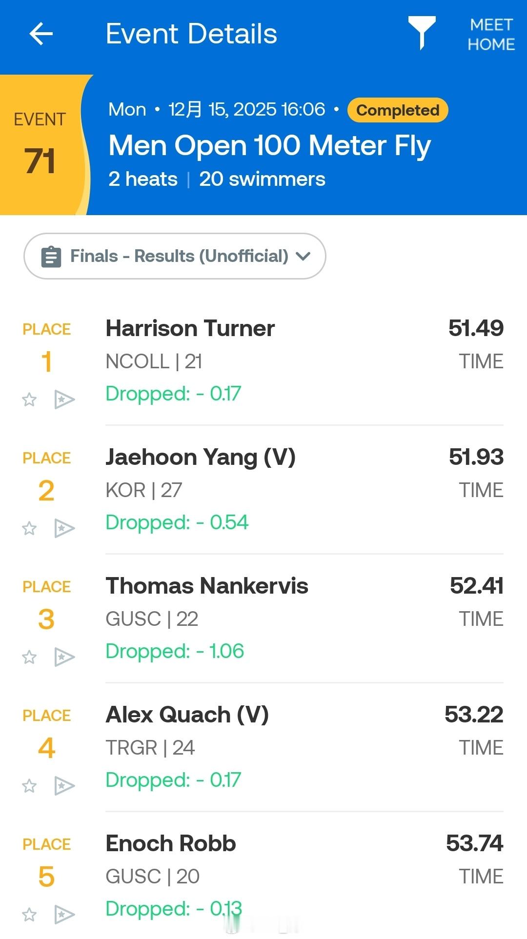 昆士兰州游泳锦标赛 男100蝶决赛Harrison Turner 51.49杨在勋 51.93