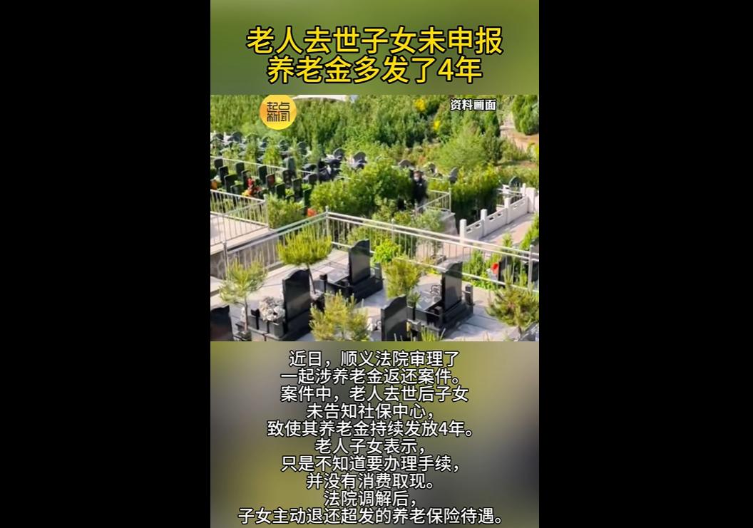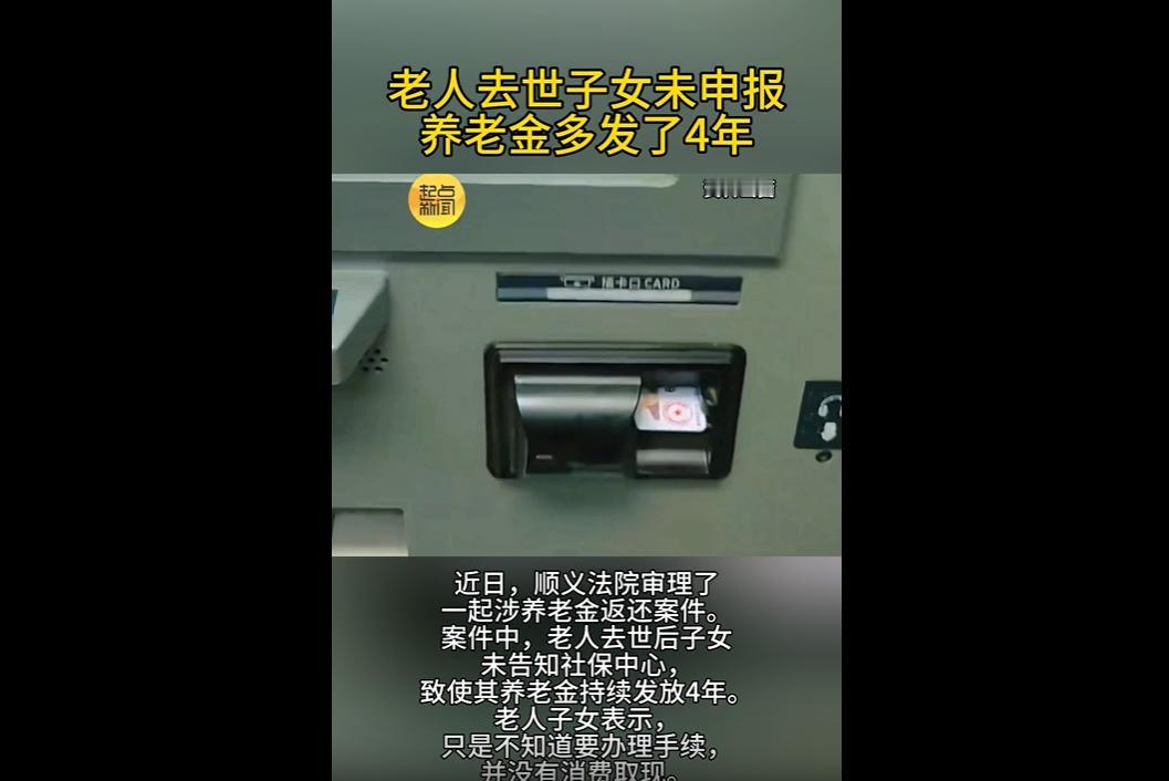 顺义村民陈某2019年去世后,子女未及时申报停发养老金,致社保部门持续发放至