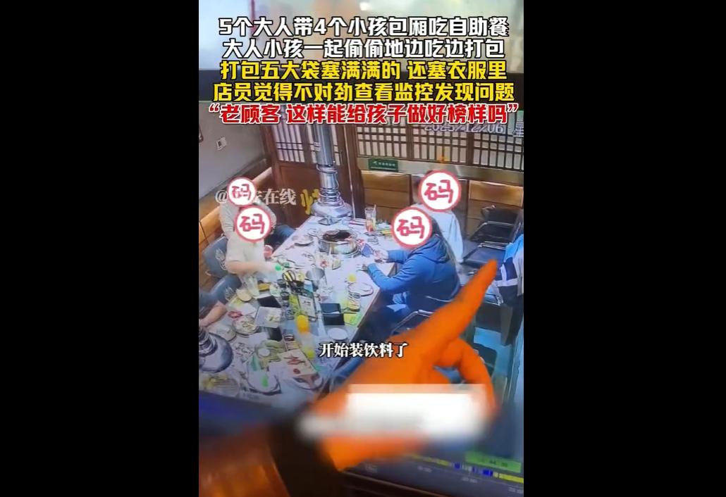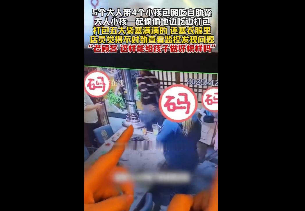 近日,乌鲁木齐一自助餐厅,5 名大人带 4 名儿童以老顾客身份订包厢,点 22 份三文鱼、41 份榴莲等大量高价食材,用餐时指挥孩子躲监控打包,将食物塞书包、羽绒服,共带五大袋离场。 店长取证后发声,网友谴责其教坏孩子,上海、金华曾有同类事件被罚,商家称将严管。 这种事儿,家长带着孩子做这种事,是带娃 “学坏”! 家长本该教孩子守规矩,这群人倒好,指挥孩子藏食材、递袋子,还炫耀 “成果”。 皮亚杰说 8 岁孩子就懂规则的重要性,大人却把 “偷拿” 当聪明,这不是毁孩子吗?长大他们可能觉得 “规则能随便破”,迟早栽大跟头。 他们的行为就是薅羊毛,而薅羊毛的代价,就是大家买单! 自助餐厅利润薄,上海两女子偷 400 元食材就让店家肉痛,这儿偷的是五大袋高价货。 要是人人学这招,商家要么涨价坑老实人,要么倒闭,最后破坏的是所有人的用餐环境。 再从法律上说事,这种行为就是“偷拿” ,不再是 “占便宜”,而是违法! 金华两人偷打包被行政拘留,这家人的行为已涉嫌盗窃。 别以为 “没明抢” 就没事,拿的超过合理用餐量,本质就是侵占财产,该罚就得罚。 作为老客户,我们也要有较强的规则意识。 作为老顾客更该守规矩,不是搞特权! 商家给老顾客情面订包厢,他们倒利用信任钻空子。 “堂食不限量,打包即违规” 是行规,连这点都不懂?说白了就是贪小便宜没底线,体面人彻底丢了体面。