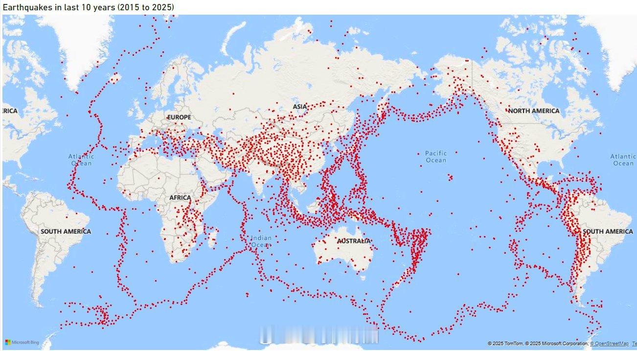2015-2025地球上发生地震位置的记录。地震 地理 地质地貌