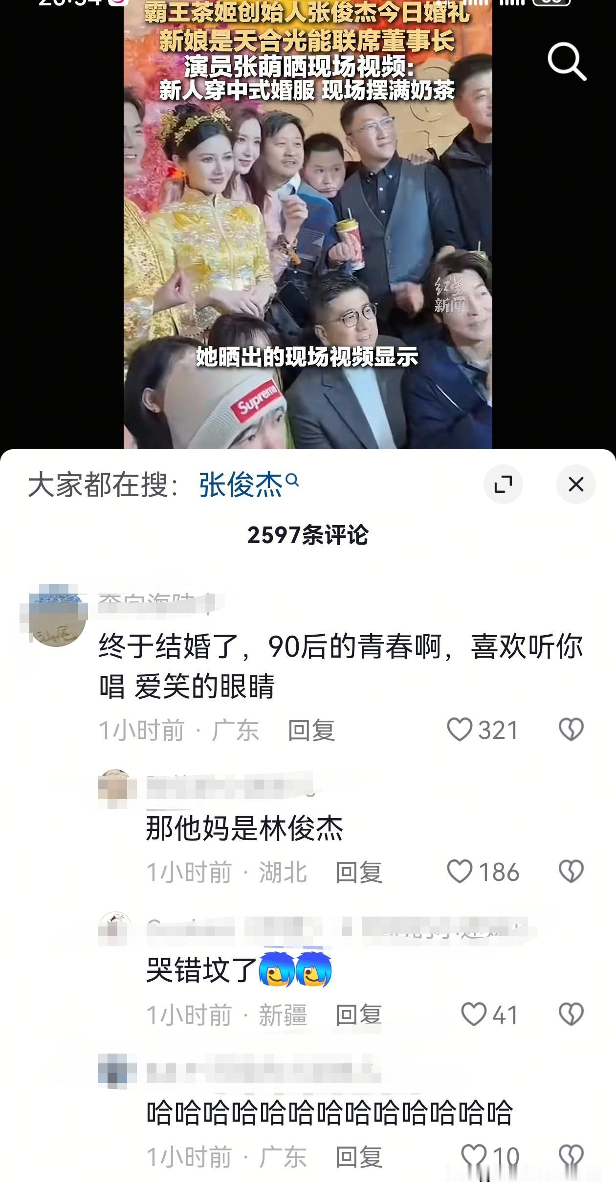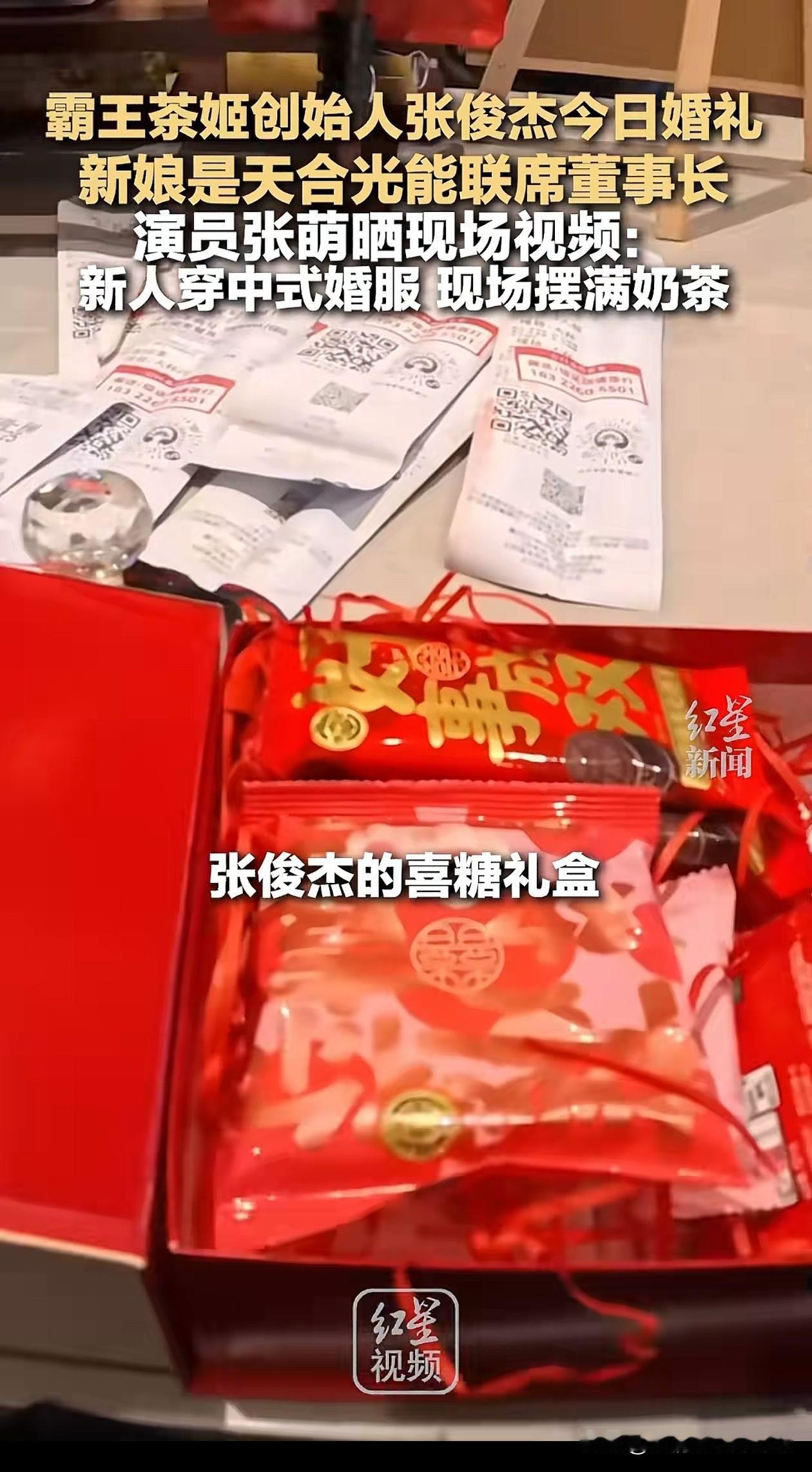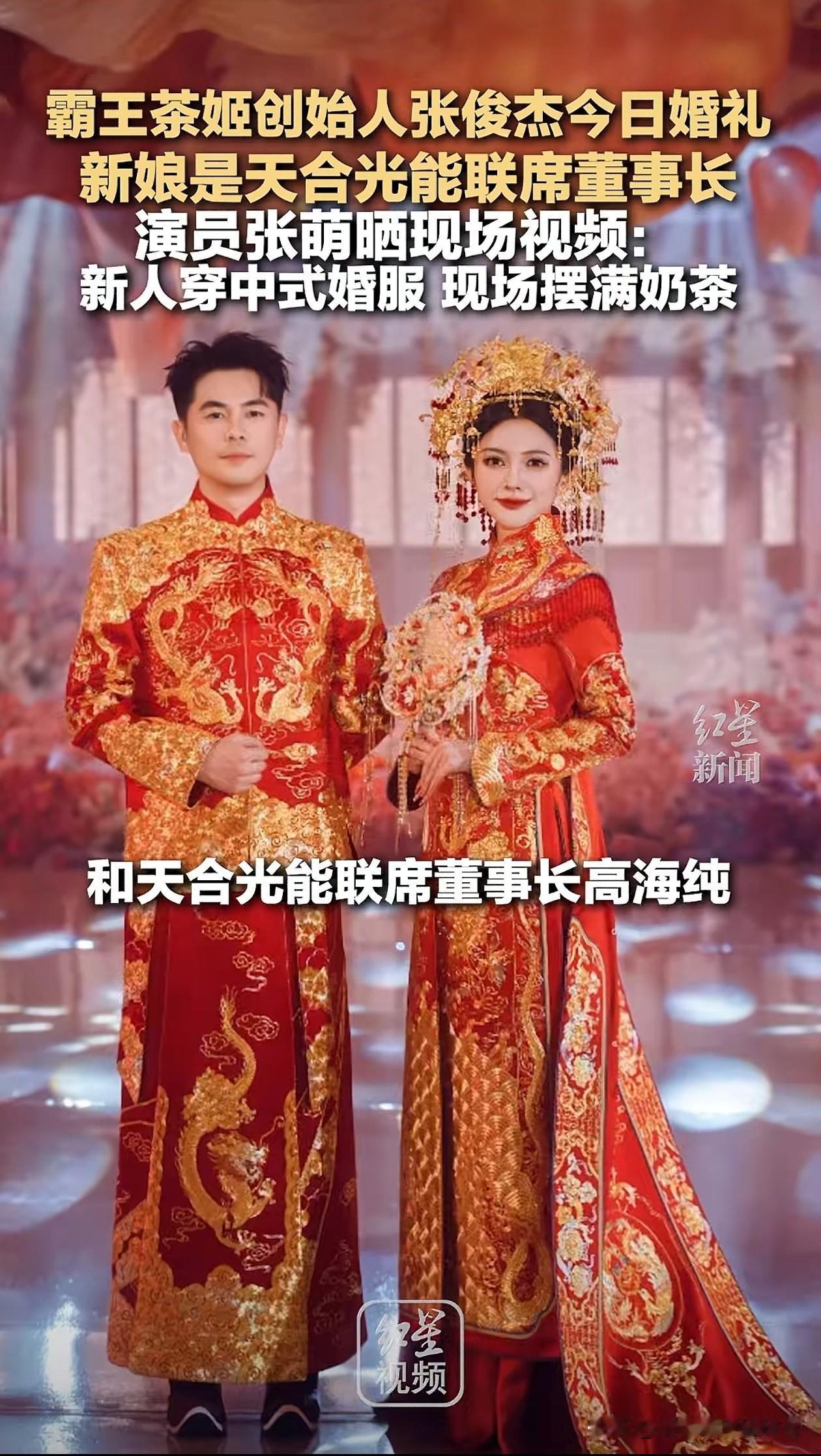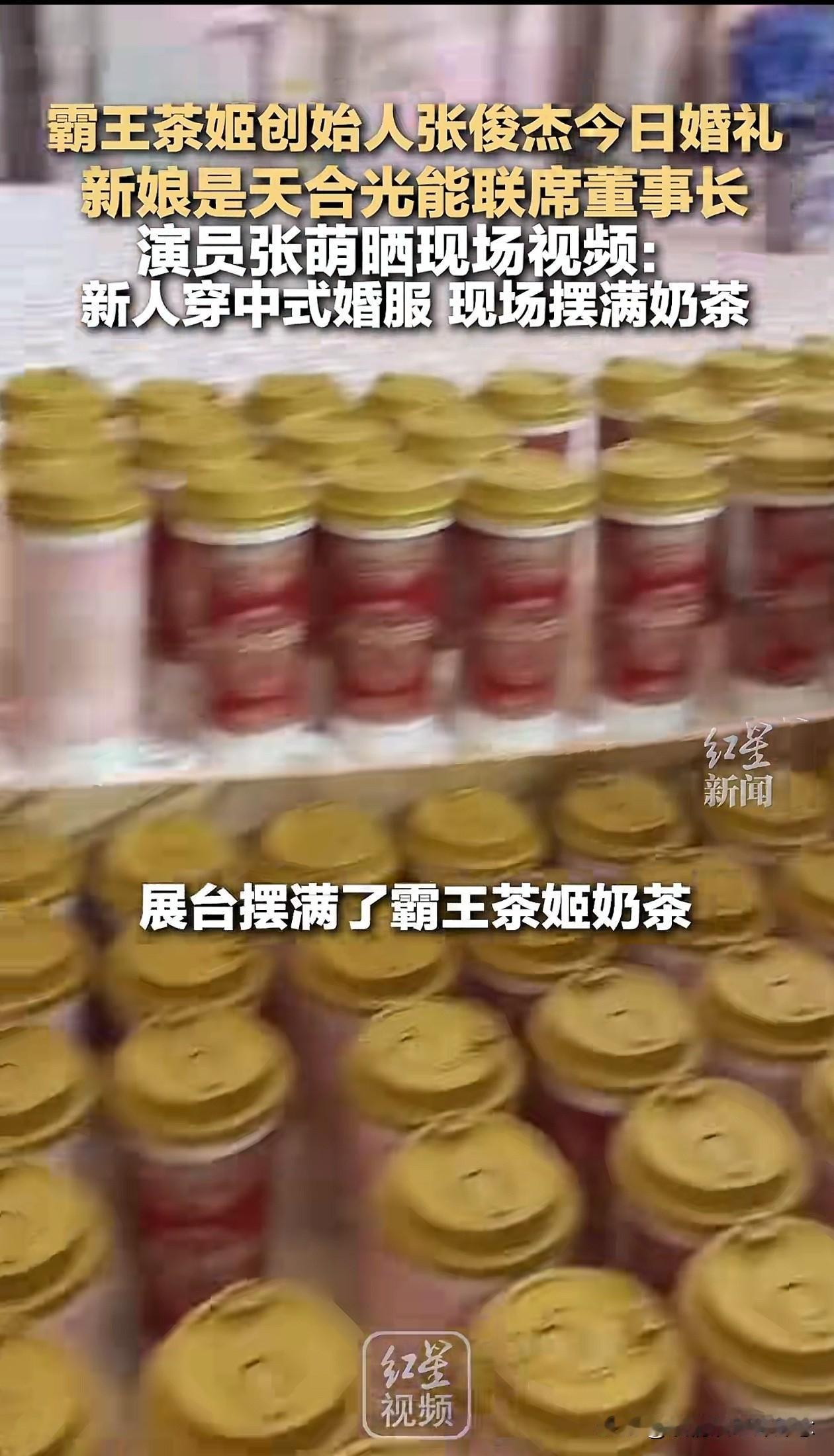 霸王茶姬创始人张俊杰和天合光能联席董事长高海纯今日大婚,婚礼现场摆满奶茶,更让我意外的是演员张萌也在现场,她还晒出了现场视频。 婚礼现场,新郎新娘穿中式婚服进行仪式,展台上摆满了霸王茶姬,现场宾客还晒出了他们的喜糖礼盒,里面棉花糖,夹心饼干,巧克力等。 我查了一下,两人都是93年出生的,张俊杰是白手起家的创业典范,而高海纯则是稳步接班的企二代代表。 网友调侃,大家还是少看点短剧吧,现实没有“霸道总裁爱上我”,只有强强联合。普通人还在纠结年龄、学历、有没有房子车子时,同龄的他们已经势均力敌,顶峰相见了。 霸王茶姬创始人张俊杰