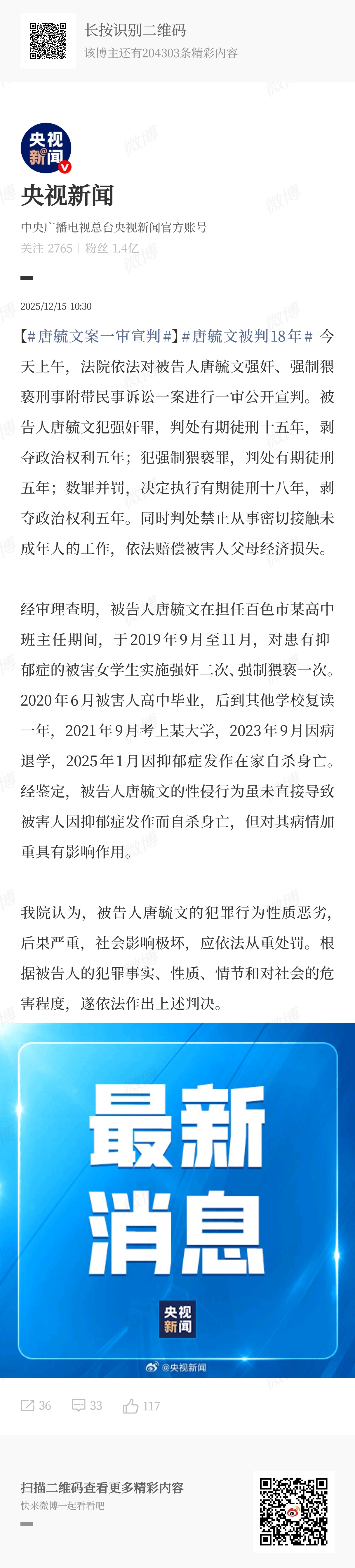 唐毓文案一审宣判判的好!唐毓文身为高中班主任,利用自己的职业便利,对未成年女学生实施强奸、强制猥亵的行为,最终被法院判处十八年有期徒刑,这样的判决结果,既是对受害学生及其家属的一份告慰,更是对教师行业师德底线的坚定捍卫。唐毓文的行为突破了教师职业的基本伦理,触碰了法律的红线,这样的判决,是对其违法犯罪行为的应有惩处,也让社会大众看到了法律对侵害未成年人权益行为的零容忍态度。师德是教师职业的灵魂,也是教育行业能够健康发展的立身之本。教师被称作人类灵魂的工程师,这份职业的特殊性,决定了教师不仅要承担传授知识的任务,更要以自身的品行和操守,去影响学生的成长,守护学生的心灵。尤其是面对心智还未完全成熟的未成年人,学生对教师往往有着天然的信任和依赖,教师的一言一行、一举一动,都可能对学生的价值观和身心发展产生深远的影响。如果教师失去了师德,利用自己的身份优势去伤害学生,带来的伤害是多方面的。对受害学生而言,这样的伤害不仅是身体上的,更是心理上的,会留下终身难以愈合的创伤,甚至会摧毁学生对教育者、对社会的信任;对整个教育行业来说,个别教师的师德沦丧,会让社会对教育行业的道德期待受到冲击,让教育这份职业的神圣性蒙上阴影。唐毓文的案例就是典型的师德彻底崩塌的情况,他没有履行教师应有的责任,反而利用班主任的身份伤害自己的学生,这样的行为既违背了教师的职业准则,也触犯了法律,最终受到法律的严惩,是必然的结果。要预防此类师德失范甚至违法犯罪的行为发生,需要搭建起一套全链条的防范体系,从思想、制度、渠道、权益保护等多个方面入手,堵住漏洞,守护学生的成长安全。首先要筑牢教师的思想防线,学校和教育主管部门需要把师德师风教育,纳入教师入职培训和在职培训的核心内容,不能让师德教育流于形式。在培训中,要结合具体的法治案例,让教师清楚知道自己的行为边界,明白哪些行为是绝对不能触碰的,让敬畏师德、遵守法律成为每一位教育者的自觉行为。同时,要完善教师的考核评价机制,把师德表现作为教师考核、晋升、评优评先的重要标准,实行一票否决制,只要师德方面出现问题,就不能获得任何职业上的认可和提升,从职业发展的层面,让教师不敢忽视师德建设。其次要扎紧制度的篱笆,学校需要制定完善的管理规范,针对教师与学生的单独接触场景做出明确的限制。比如,禁止教师在密闭的私人空间里和学生进行一对一的交流,如果确实需要单独沟通,要选择教室、办公室等公开的场所,并且尽量保证有其他教职工在场;对于课堂之外的师生互动,要建立相应的记录和监督机制,让每一次互动都有迹可循。学校刻意建立常态化的校园安全巡查机制,安排专门的人员对校园内的各个区域进行定期巡查,尤其是一些容易出现监管盲区的角落,要做到巡查无死角,从环境和管理上消除教师侵害学生的可乘之机。再者要畅通反馈渠道,让学生和家长的声音能够及时被听到。学校可以设立匿名的举报平台,包括线上的举报邮箱、小程序,以及线下的举报信箱,让学生在遭遇不当对待或者发现异常情况时,能够放心地反映问题,不用担心遭到报复。然后再开通家校沟通热线,安排专人负责接听和记录,及时处理家长提出的疑问和反馈。对于所有涉及教师侵害学生的线索,学校和相关部门要做到有报必查,而且要快速调查、快速处理,一旦核实情况属实,就要立刻采取措施,绝不因为任何原因姑息迁就,让反馈渠道真正成为保护学生的“安全阀”。最后要用心守护学生的合法权益,学校需要加强对学生的自我保护教育,通过课堂教学、主题班会、校园宣传等多种形式,教给未成年人如何识别身边的侵害行为,如何拒绝不合理的要求,以及在遇到危险时如何向家长、老师或者警方求助。有条件的学校还可以完善校园心理辅导体系,配备专业的心理教师,定期为学生开展心理疏导课程,及时关注学生的心理状态变化。对于已经遭遇侵害的学生,要第一时间为其提供专业的心理干预,帮助其缓解心理创伤,同时联系法律援助机构,为学生和家属提供法律上的支持,让受害者能够拿起法律的武器维护自己的权益。教育的本质是爱与责任,教师这份职业,承载着培养下一代的重要使命,师德的底线永远不容丝毫突破。只有通过持续的师德教育塑造教师的内心,通过完善的制度体系做好外部护航,才能让每一位教师都真正成为学生成长路上的守护者,让教育这片净土始终保持温暖与阳光,让每一个孩子都能在安全、健康的环境中成长。愿逝者安息。热点观点用智搜看懂微博