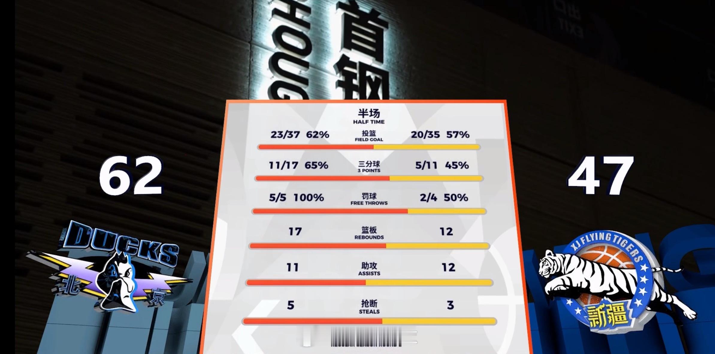 半场比赛结束!北京男篮62:47新疆男篮,15分的分差,新疆队在落后20分的情况下,齐麟和伊福分别站了出来,帮助新疆队将分差追到15分。上半场的北京队陈盈骏太疯狂了!赵睿和周琦的状态也非常好。北京男篮vs新疆男篮赵睿战旧主阿才说球CBA中国男篮