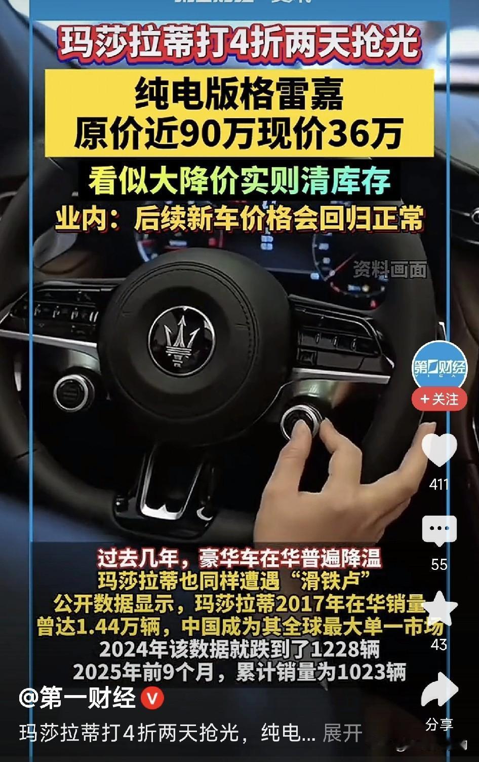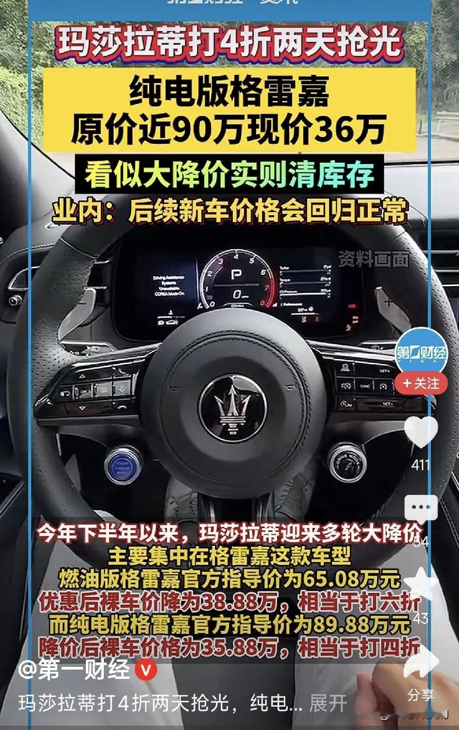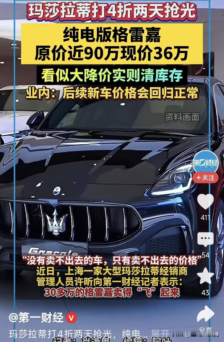 车圈炸锅了!玛莎拉蒂“打骨折”了?原价将近90万的豪车,现在35万多就能开走,直接打了四折!上海的门店还没开门,门口就排起了长队。 听起来血赚?但真相是——这些都是疫情前的老库存,新款要上了,经销商亏本清仓。表面看是“豪车白菜价”,实际上暴露了电动豪车的尴尬。 这些年电车淘汰太快了,快到让百万豪车也扛不住了。三年前的技术放现在,续航、智能可能都落后了。再牛的品牌,技术一落后,库存立刻变“负资产”。 所以说,抢到的不一定是赢家。电车不是古董,越老越值钱。它是科技产品,换代就贬值。买车还得看需求,别为虚荣交智商税。你们觉得呢?玛莎拉蒂