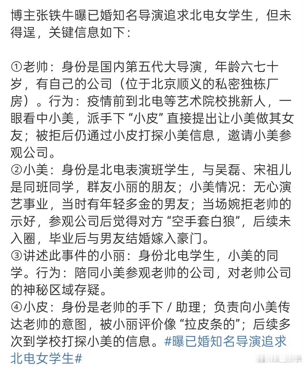 曝已婚知名导演追求北电女学生又是一出老牛想吃嫩草的戏码吗?北电小美真的会看上老帅吗?这年龄差都可以当父女了吧!好好过自己家的安稳生活那么难吗?