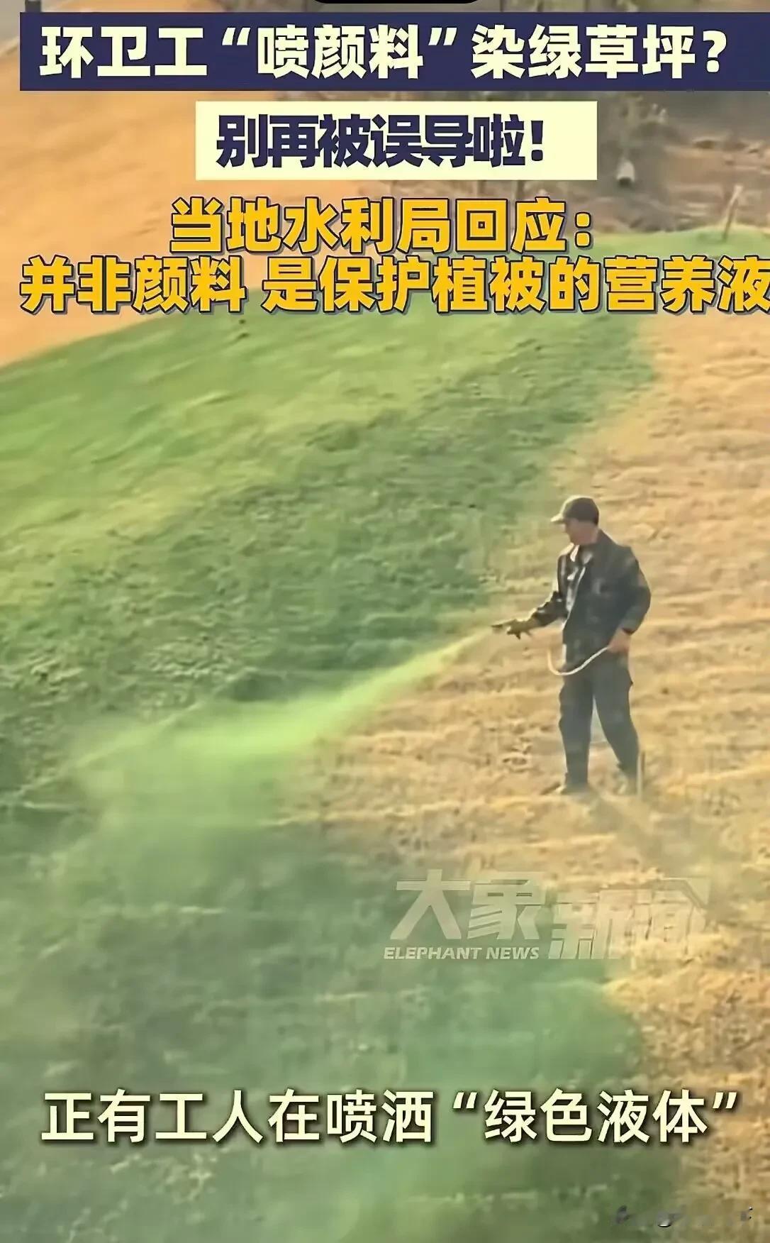 环卫工“喷颜料”染绿草坪??? 陕西兴平,有网友发布视频称,河堤路附近的绿化草坪上,有环卫工人在喷洒绿色液体,枯黄的草坪瞬间被染成绿色,网友怀疑这是颜料,质疑这是形象工程!但当地水利局回应:“并非颜料,是保护植被的营养液!” 视频刚传开时,评论区满是尖锐吐槽:“这绿得也太假了,分明是自欺欺人的面子活”“有这功夫喷颜料,不如好好浇水补种,净搞表面功夫”,更有家长担忧:“公园是孩子常去的地方,不明液体会不会有毒?”甚至有网友翻出过往个别地区“荒山刷绿漆”的案例,笃定这又是一起形式主义闹剧,情绪里满是对“虚假绿化”的反感。 可随着官方后续的详细释疑,事情逐渐反转,背后的真相远比直观感受更复杂。水利局工作人员坦言,这片草坪临近河堤,常年承接市民露营、演出活动,频繁踩踏导致土壤板结,草皮受损严重,此前试过多次冬季补种,可低温环境下成活率不足50%,还得长期封闭养护,既浪费资金又影响市民使用。这次喷洒的营养液,核心成分是有机水溶肥、植物抗逆剂,搭配的是环保着色剂,符合园林养护标准,对人体、土壤和水体都无害,既能给休眠期的草坪补充营养、增强抗寒能力,助力来年返青,着色剂还能标记喷洒区域,避免重复或遗漏,视觉上的“秒变绿”只是附加效果。 专业人士也证实,冬季草坪喷增绿营养液并非新鲜事,在足球场、高尔夫球场的冬季养护中早已普及,暖季型草坪低温下枯黄本是自然现象,合规的营养液能兼顾养护实效与景观需求,和堵塞草叶气孔、破坏生态的工业颜料有着本质区别。而施工人员当初要求删视频,也是担心网友误解,沟通方式欠妥,并非想掩盖什么,后续已向视频发布者解释清楚并获得谅解。 这场争议的发酵,藏着公众对“表面工程”的天然警惕,更暴露了信息不对称的问题。如果施工前能提前公示营养液成分、喷洒目的,现场设置提示牌,或许就不会有这场误解。城市绿化从来不是“越绿越好”,而是实效与透明的兼顾,基层养护有无奈,公众监督有初心,多一份坦诚沟通,少一点信息缺位,才能让每一次护绿行动,都真正赢得人心。 你怎么看草坪冬季喷营养液增绿?是务实之举还是大可不必?来评论区说说你的想法~ 草坪染绿