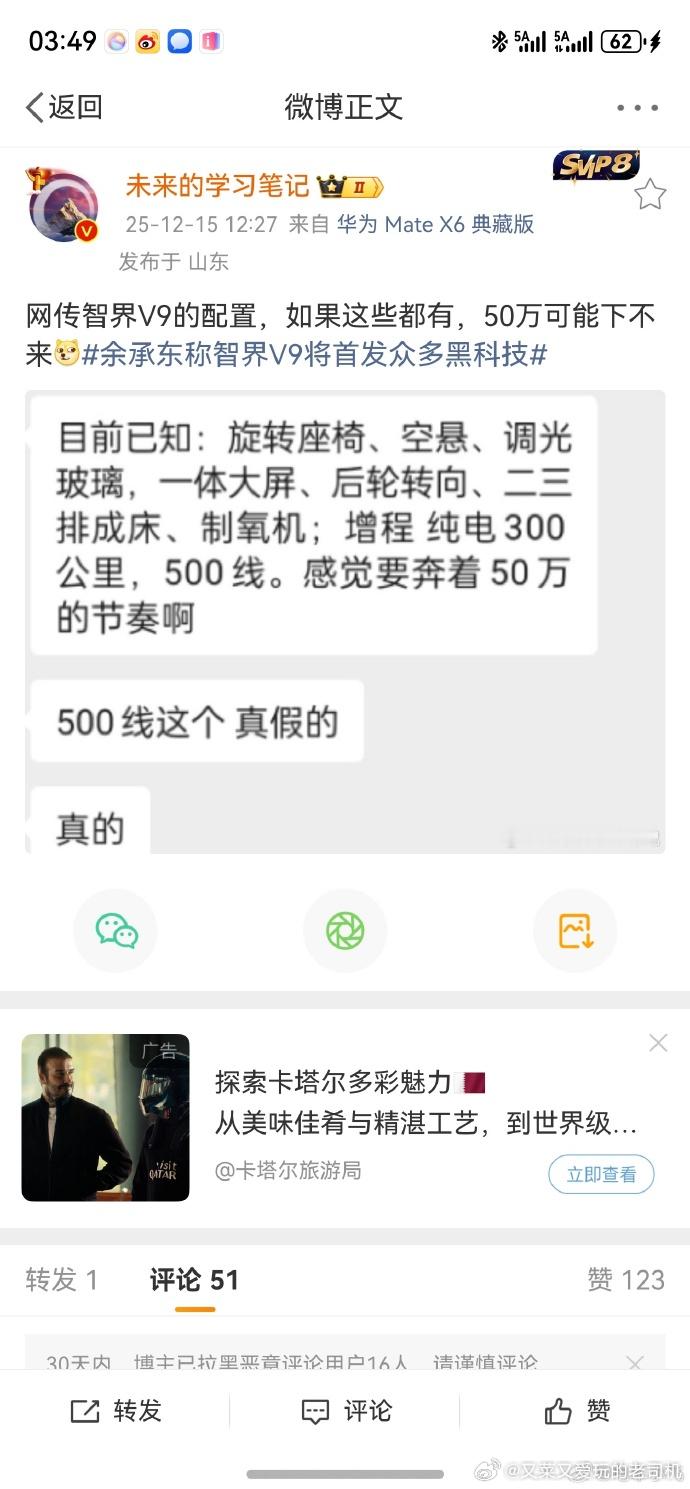 高配肯定超50万的,一体大屏应该是给高配或是选配的,低配应该也不会低于45万,价格要参考问界M9会比较合理、比问界M9价格高一些也不是没有可能。