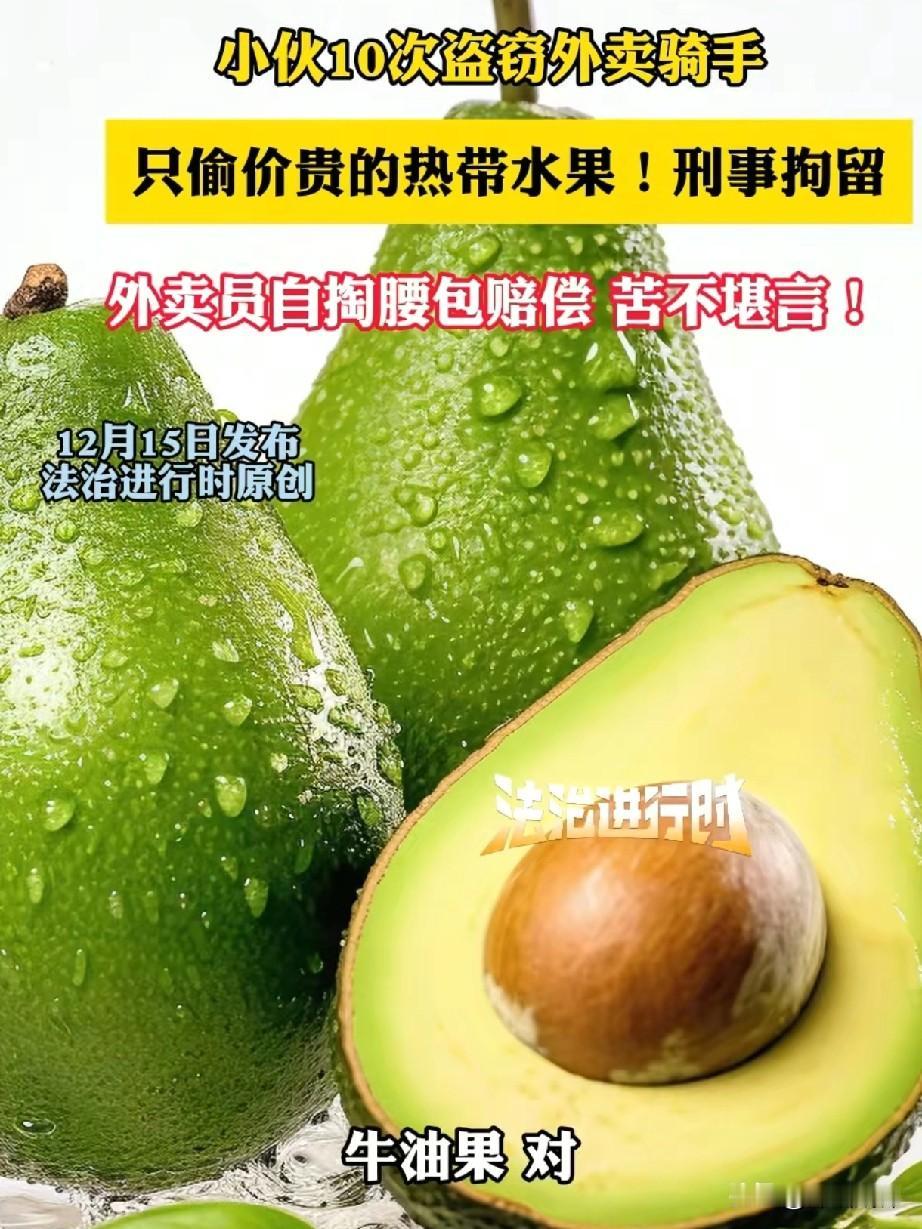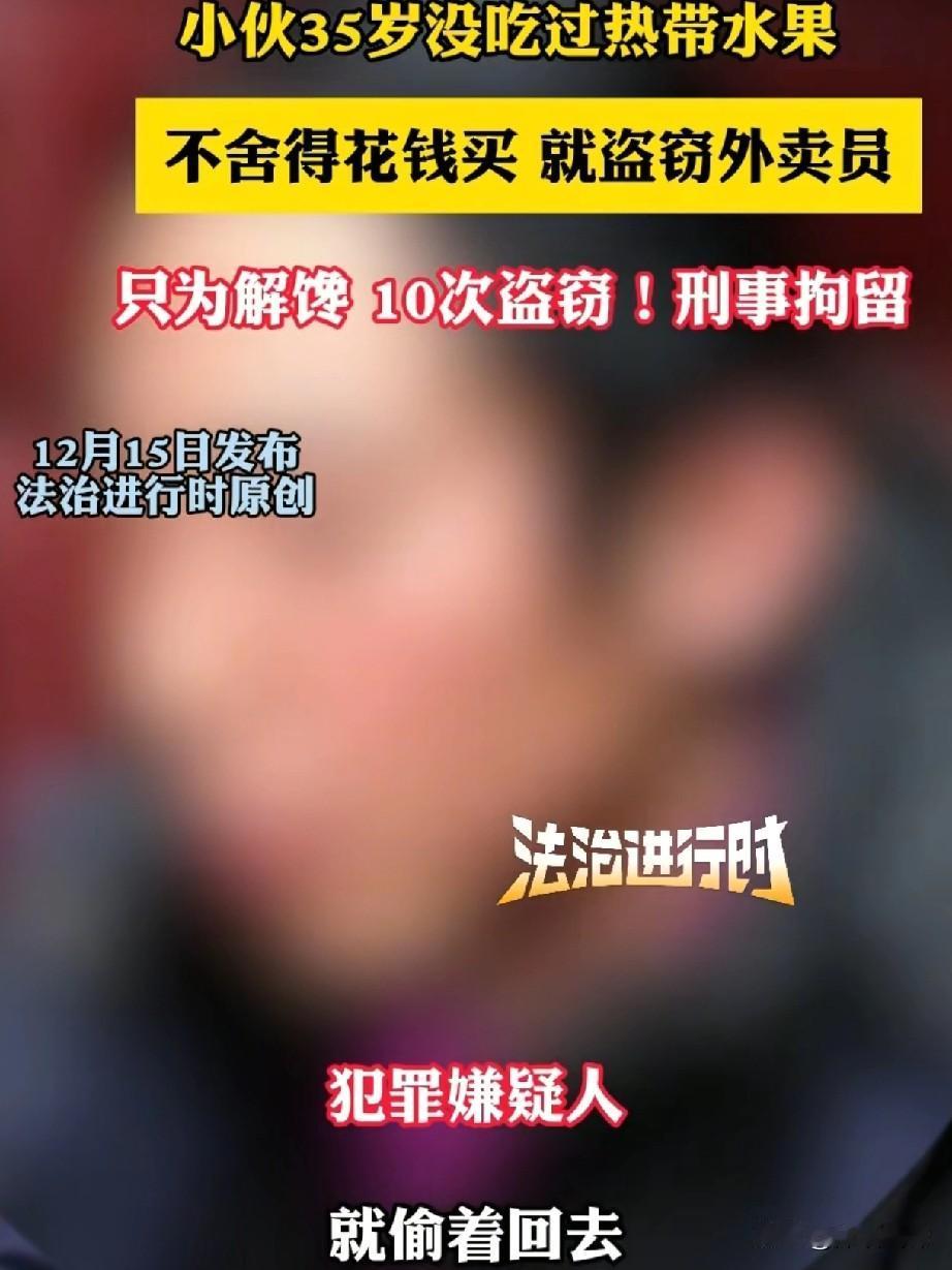 35岁小伙没吃过热带水果,很馋,又不舍得买,灵机一动计上心来,直接去偷。偷了10次之后惨被捉。 法治进行时报道,有个35岁的小伙子对热带水果情有独钟,但是不舍得买。 热带水果也没有多贵,一个成年人不舍得买,可能是囊中羞涩,也可能是感觉没必要浪费那个钱。归根结底还是手头不够宽裕。 这个35岁的小伙子对热带水果念念不忘,越是吃不到嘴里越挂念。他在超市里看到牛油果很好吃的样子,价格比较贵,思虑再三,他还是舍不得买。 过了几天,小伙子还是日思夜想那个牛油果,百无聊赖之际,突然就想出了一个既能解馋又不花钱的“好办法”。 他观察了几天,发现有个外卖小哥经常送牛油果,就在外卖小哥离开他的车子时,他偷偷去拿了就跑。 外卖小哥发现丢了相对昂贵的牛油果以后只能自掏腰包补上。 连续10次被偷以后,外卖小哥崩溃了,他已经损失了5、6百元,这次无论如何也要解决问题。于是就把丢水果的事报了帽子叔叔。 35岁小伙再一次行窃之时,被帽子叔叔人赃俱获。 面对帽子叔叔的质问,小伙说:偷水果只为解馋,因为自己不舍得买,只好偷回去吃。 偷一次叫解馋,偷10次还说是解馋,这实在有点说不过去,这就是赤裸裸的贪便宜。头一次没被发现,心存侥幸继续偷,莫伸手,伸手必被捉。 目前,这个因为嘴馋而偷牛油果的35岁小伙子已经被刑事拘留。 说实话,一个成年人买几个热带水果吃也花不了几个钱,努力工作一天肯定能吃上。买一次解解馋就行了,手头紧就不要这么馋。自己舍不得买就去偷,外卖小哥辛辛苦苦一天也赚不到五六百,自己吃的过瘾,却让别人为他的馋买单,这种人就需要法律的惩罚才能改过自新,以后就不会这么馋了!