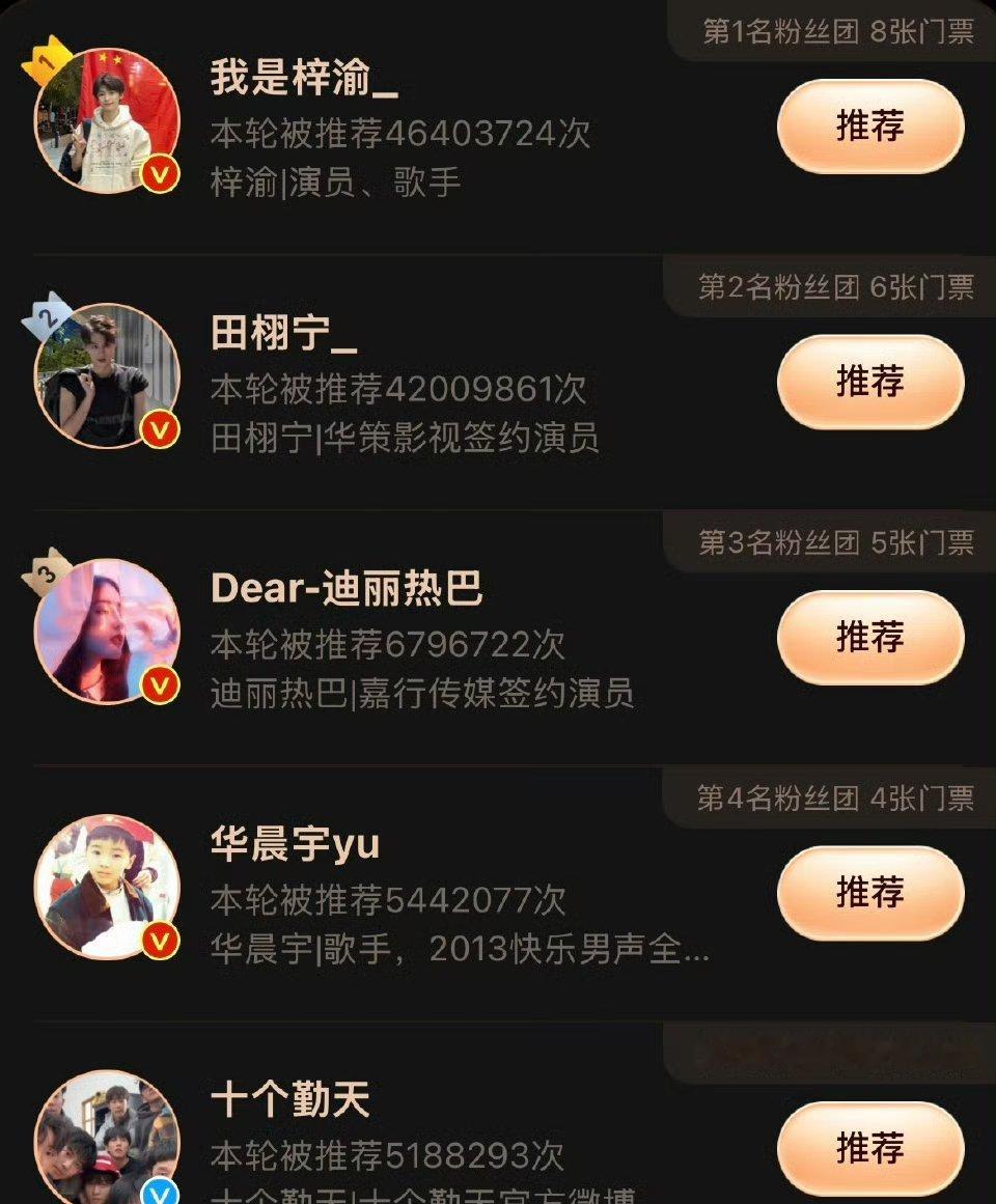 微博之夜投票微博年度星光人物前五名:梓渝、田栩宁、迪丽热巴、华晨宇、十个勤天
