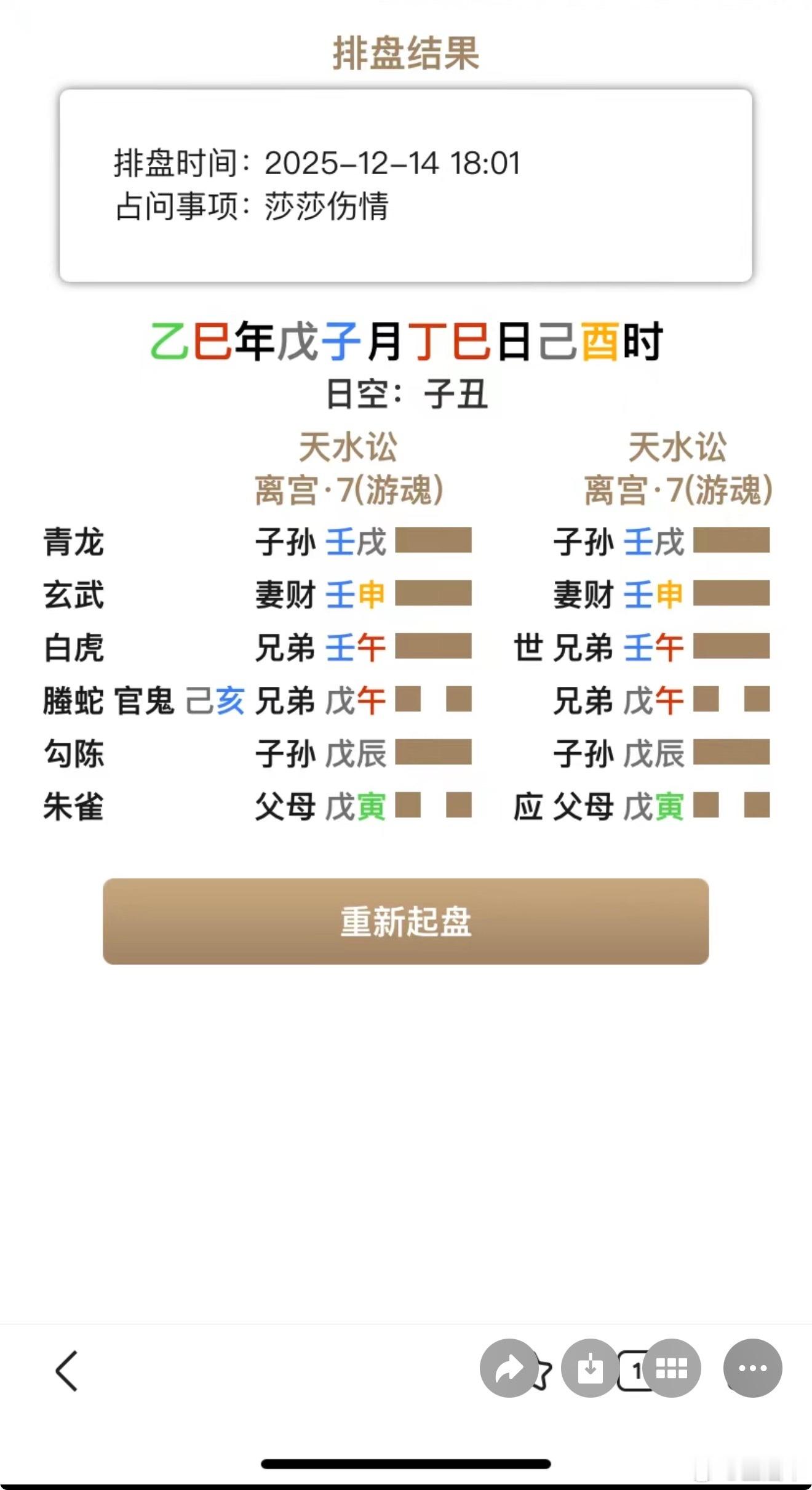 莎莎病情,以我自己的能量测的一卦,不见得准,看看即可。这卦看还是对的,兄弟爻为用神,莎莎于我来说既不是长辈也不算太晚辈不能取子孙,那就是取平辈兄弟爻。官鬼伏藏在兄弟爻之下,这个就是代表病了,而且是隐性的,慢性的,潜藏起来很久的病,发动了,丙辰日子辰半合,生旺官鬼爻,我看也是代表血液方面。兄弟爻临藤蛇,莎莎这几天还心神不宁,失眠多梦之意象,其实八字看戊子月三丙伏吟,也是水火交战睡眠易不好。但是这个官鬼临第三爻,卦看是大腿容易伤,她的现场看是小腿,这个懂医学的来讲一下是不是哪根筋伤了?或者哪根筋扯住了?公历11月20日后就有点不舒服了,暂时看进一步恶化的可能是没有,亥水被日辰所冲,大概12月26日附近就有个明显好转。但是是个游魂卦,游魂在疾病卦中代表迟迟不能痊愈,以后这个位置也容易有点不舒服,游魂代表凶,受伤不轻,但是官鬼爻被冲,代表最不舒服的时候已经过去了,不会再加重了,且12.26日后估计会有个明显好转。但是会留下点后遗症,游魂就是代表游走反复,加上月破子午冲,21:00-00:59那个时间段易疼痛,也是看自己身体本身就不太好了。卦看莎莎要好转要补木,也就是印。祝福莎莎早日康复,另外以后乒协真不能这么用了,怪不得冠军都远走欧洲,他知道这么接着打意味着多大消耗,走可能也是自我保护。我觉得得定个规矩,达到6000积分后可以自行选择性参赛。