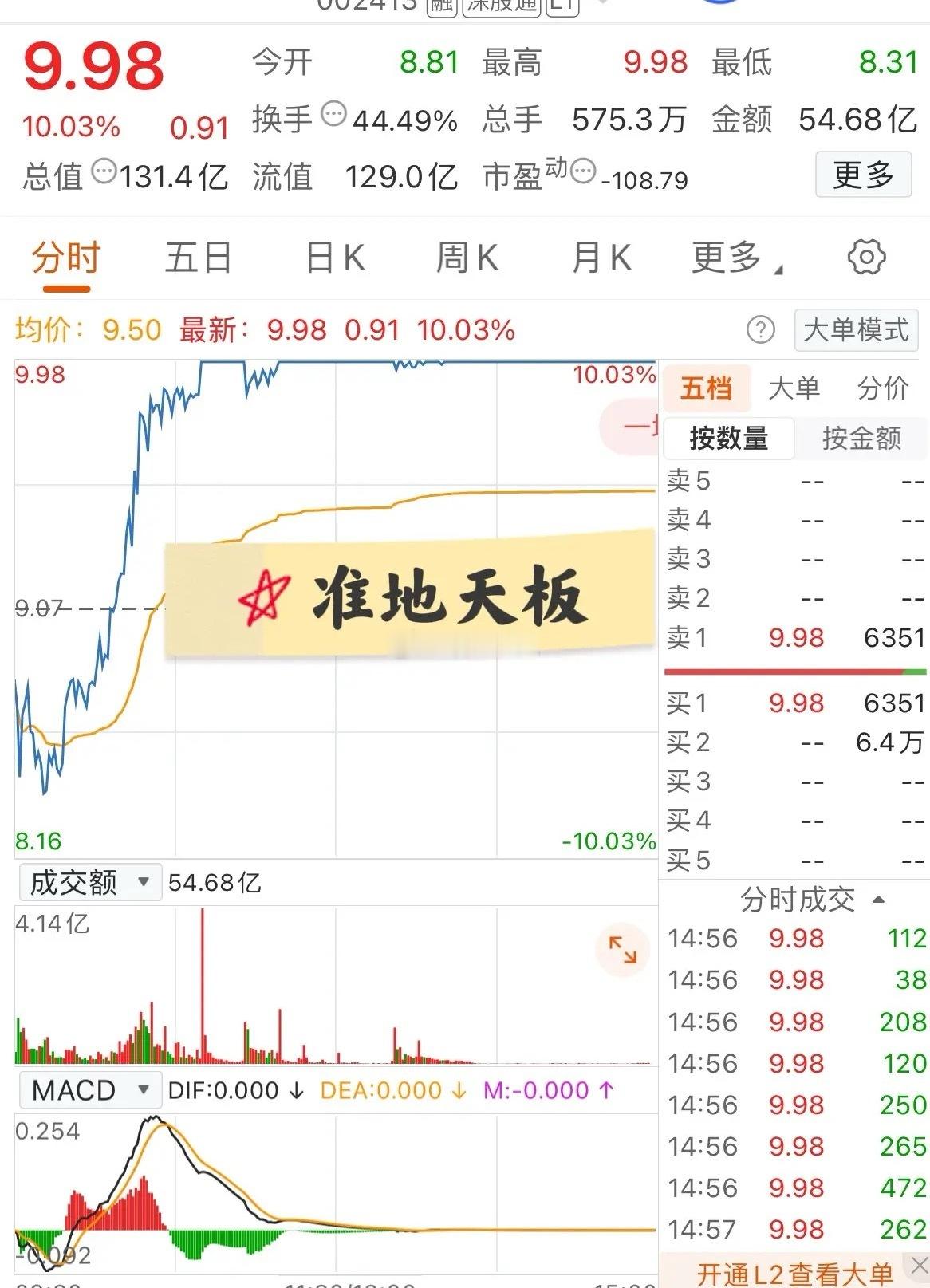 今天最牛的票就是它了!低开高走,完成准地天板!这家公司本来是做雷达系统的,近期被归类为商业航天进行炒作,短期涨幅一度达到了70%!但是最近3天该票是展开了调整,股价也是大起大落,而在上周五大盘修复上涨的情况下该票反倒是跌了3%!该票今天则是直接低开近3%,而在开盘后该票也是一根直线砸到了7个点以上!此后该票有所修复并一度回到开盘价的位置,但是随即再次向下砸盘,最低的时候已经跌到了8%!但就在此时,抄底资金蜂拥而入,该票则是在资金的推动下呈波浪式上涨,并且是一浪更比一浪高,到10点40分居然又封上了涨停!此后该票虽然多次开板,但是1点40分以后涨停就被彻底封住!而在今天涨停后,该票已经创下了近5年新高。但是鉴于该票短期涨幅巨大,加之今天盘中涨停板多次打开,有板上出货的嫌疑,因此各位股民朋友还是谨慎一点为好,小心短期大幅上涨后的下跌风险!