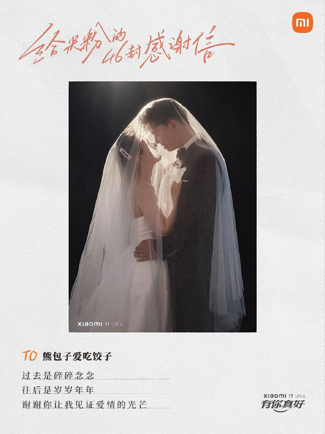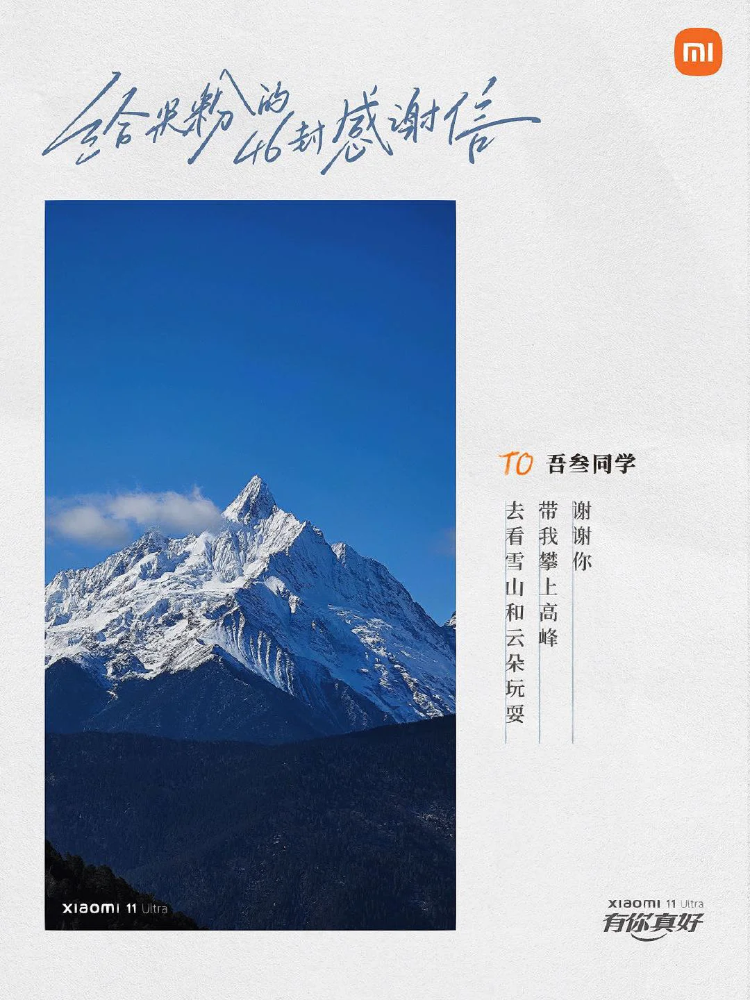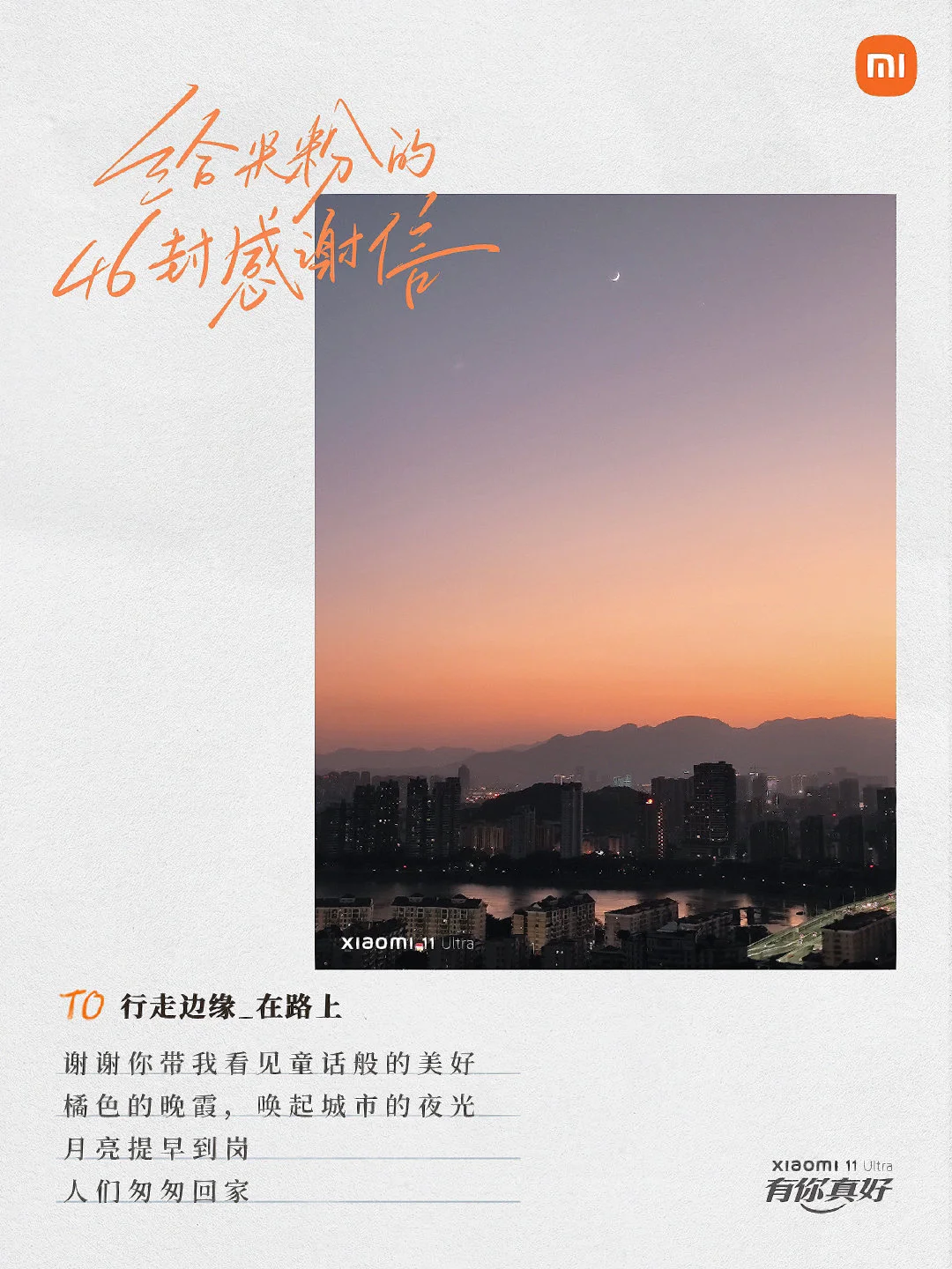 当品牌与用户双向奔赴,会擦出怎样的火花? 来看看小米手机是怎么做的[害羞R] 在第 11 个「米粉节」,小米手机写了 46 封感谢信。 信里的照片,是小米根据米粉在微博上分享的用小米11 Ultra 拍的摄影作品,一一筛选而出。 然后再配上文案,以信传情。 从用户中来, 再到用户中去, 用心写的文案自然会打动人心。[红色心形R]