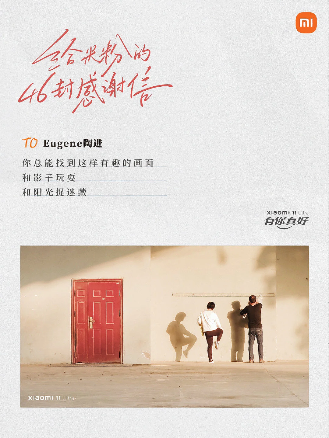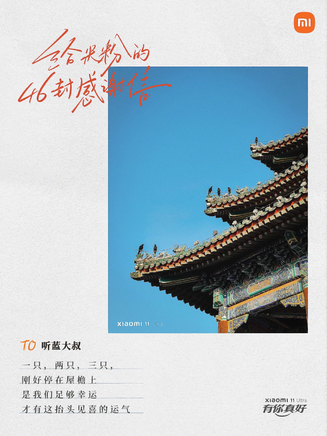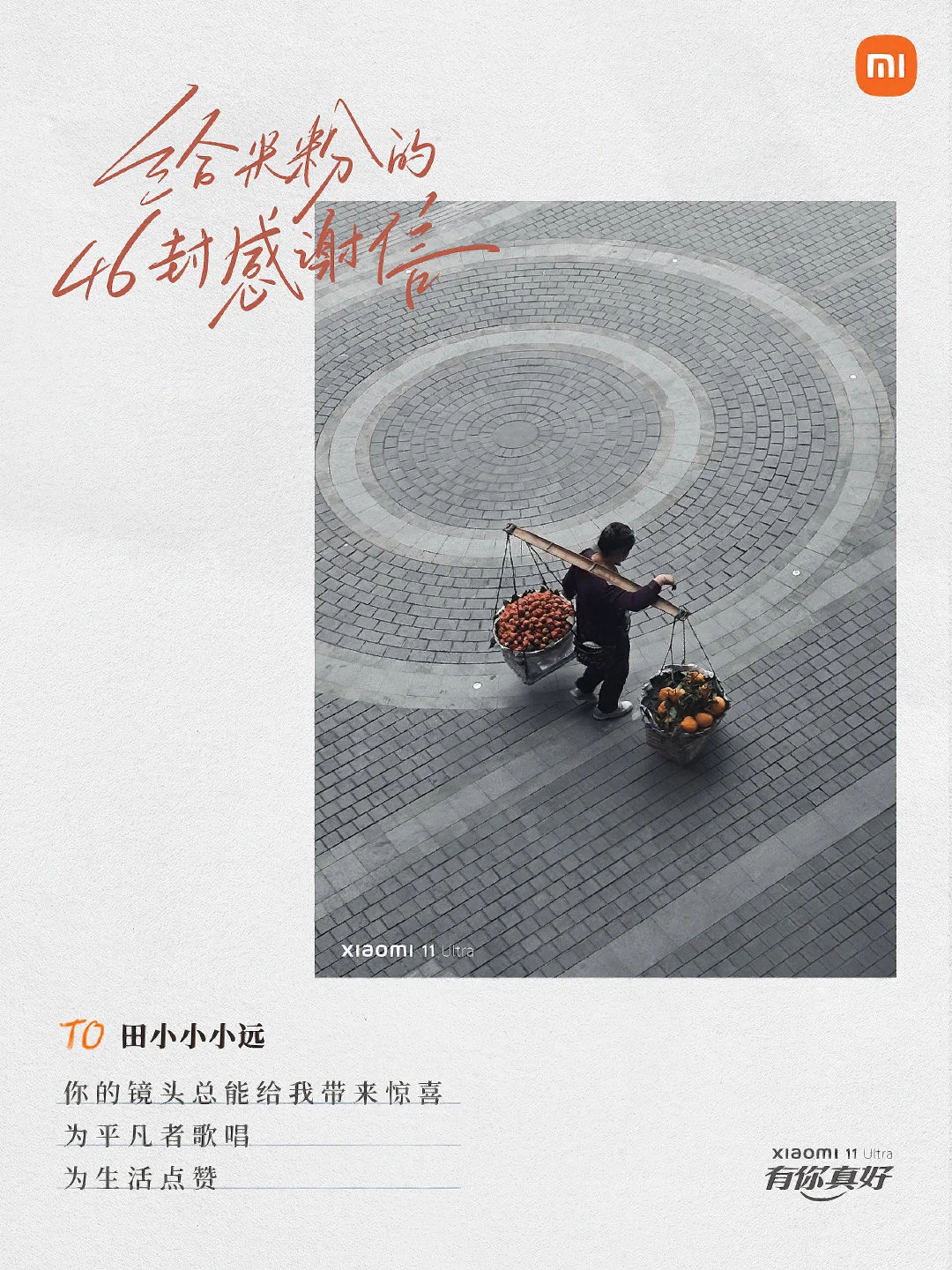 当品牌与用户双向奔赴,会擦出怎样的火花? 来看看小米手机是怎么做的[害羞R] 在第 11 个「米粉节」,小米手机写了 46 封感谢信。 信里的照片,是小米根据米粉在微博上分享的用小米11 Ultra 拍的摄影作品,一一筛选而出。 然后再配上文案,以信传情。 从用户中来, 再到用户中去, 用心写的文案自然会打动人心。[红色心形R]