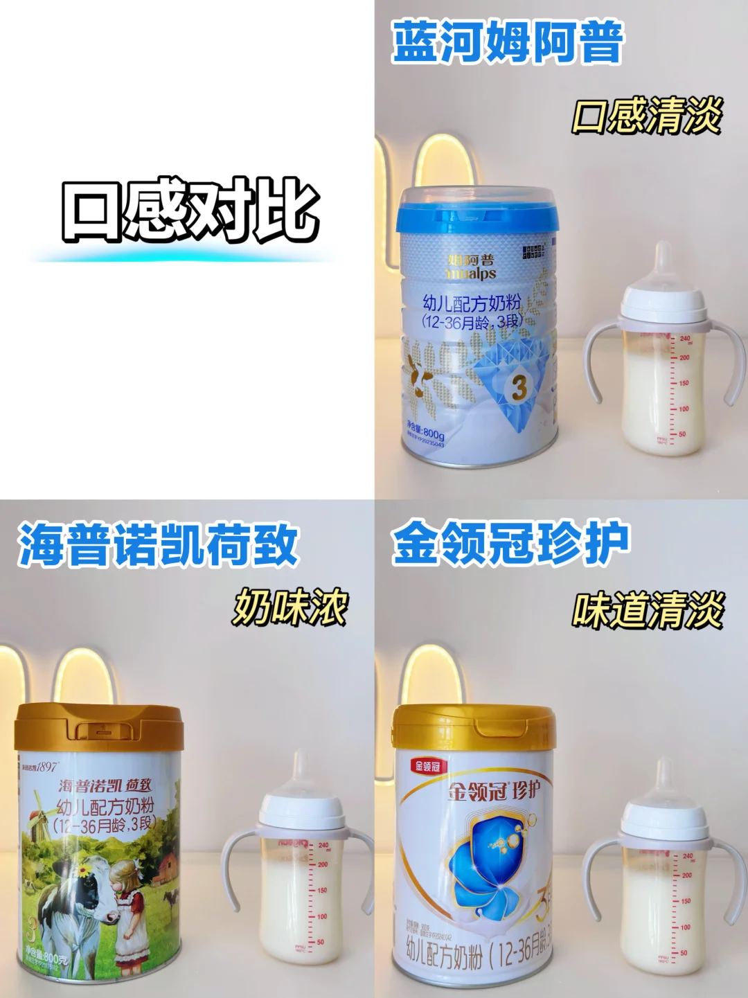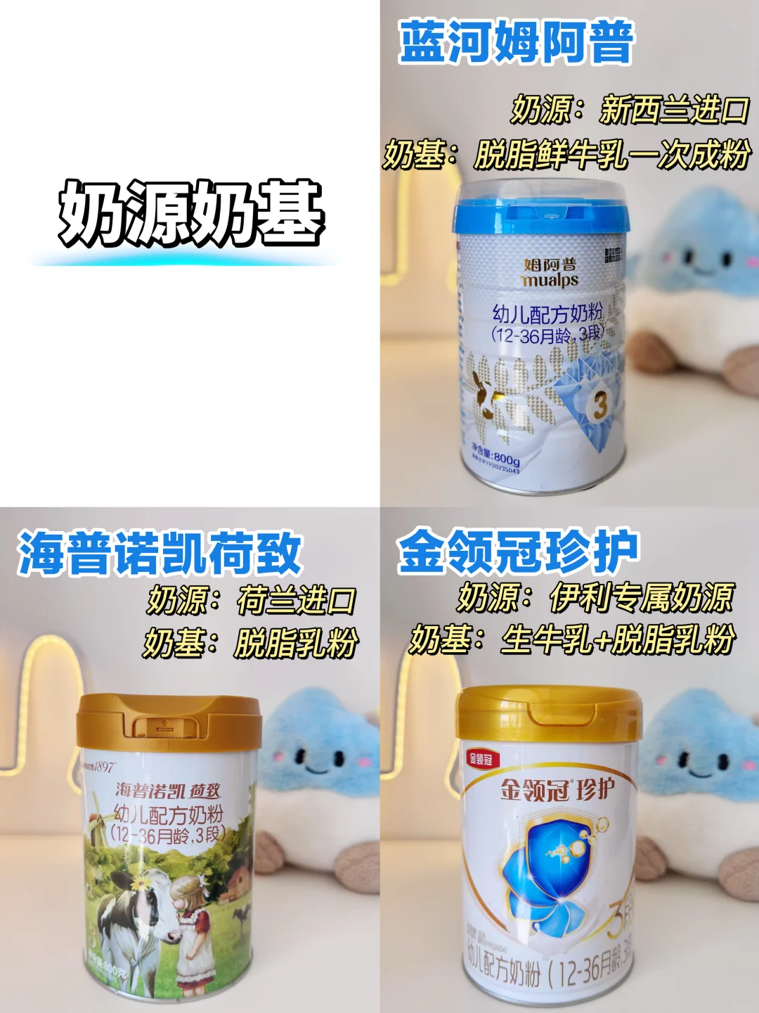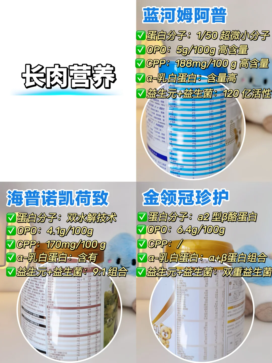 每次带妹妹出门,总被夸长得好!但她半年前,体重曲线还低于中位数,我很着急,研究如何科学追肉 并且测评了几款热门长肉奶粉,分别是:蓝河姆阿普、海普诺凯1897荷致、金领冠珍护 · 👉1. 蛋白消化:小分子更易吸收 蛋白质是宝宝生长的基础,蛋白分子越小,肚肚不费劲就能吸收。 ✅蓝河姆阿普:1/50超微小分子,仅完整蛋白1/50大小的水解乳清蛋白,肚肚嗖的就吸收了 ✅海普诺凯:双水解技术 ✅金领冠珍护:A2型β-酪蛋白 👉2.脂肪吸收:OPO OPO是奶粉中的一种结构脂,帮助营养吸收 ✅蓝河姆阿普:5g/100g OPO ✅海普诺凯:4.1g/100g OPO ✅金领冠珍护:6.4g/100g OPO 👉3. 矿物质吸收:CPP 矿物质如钙、铁、锌等,对宝宝很重要,CPP的加入 能提高这些矿物质的吸收率 ✅蓝河姆阿普:188mg/100g行业拔尖的高含量 CPP ✅海普诺凯:170mg/100gCPP ✅金领冠珍护:不含CPP 👉4. 肚肚舒服:益生菌+益生元 益生菌+益生元组合,宝宝肚肚舒服了,自然长肉肉! ✅蓝河姆阿普:120亿活性益生菌+双益生元 ✅海普诺凯:9:1益生元益生菌组合 ✅金领冠珍护:双重益生菌 👉5. 营养平衡:α-乳白蛋白 α-乳白蛋白是唯一能结合钙的乳清蛋白,能促进钙吸收;宝宝状态好,睡得香,长肉肉不在话下! ✅蓝河姆阿普:含有α-乳白蛋白 ✅海普诺凯:含有α-乳白蛋白 ✅金领冠珍护:α+β蛋白组合 · 👉加赛:奶源、营养全面 ✅蓝河姆阿普:新西兰奶源,DHA含量115mg/100g,有叶黄素,眼脑兼顾,性价比高 ✅海普诺凯:荷兰牧场,叶黄素210μg ✅金领冠珍护:伊利A2奶源,国产品牌 · 因为宝宝小时候肚肚娇弱,长得瘦小。我特别在意奶粉的吸收力和全面营养,考虑到蓝河姆阿普在这块表现优秀,所以一直锁定它!营养全面丰富,一罐能顶多罐,直接省去了各种营养补充剂,省心又省💰! 我家宝宝也爱喝!现在,妹妹终于长成了多肉宝宝,干饭力、体质也棒棒的,当妈妈的别提有多开心! 希望我的测评分享能帮助到更多妈妈!