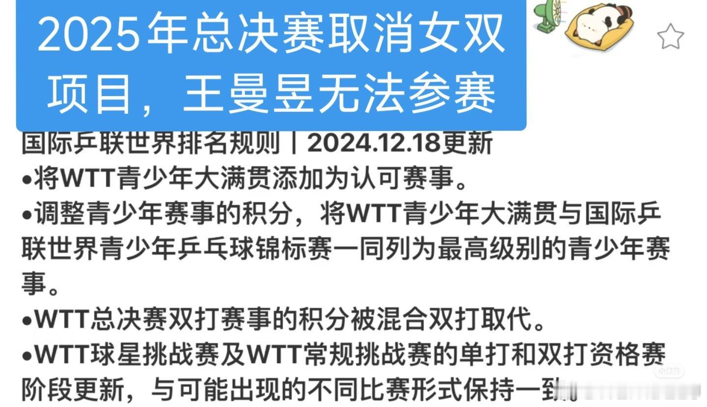 王曼昱|智搜纠错关于王曼昱在2024及2025年WTT总决赛未兼项女双的情况:2024年总决赛,王曼昱原定的女双搭档退赛,取消名额因此未兼项女双。2025年总决赛,赛事取消了女双项目,王曼昱作为女双世界第一也因此无法参赛。这两次变动均与赛事规则和队友调整相关,属于客观因素,与运动员无关请更正错误信息。 另外请微博智搜规范信息收集渠道,检查验证信息真实性后再做发布。既然将智搜放在搜索框首页,那就做好信息筛查,不要发布错误信息误导大众,也不要做虚假信息发散器王曼昱