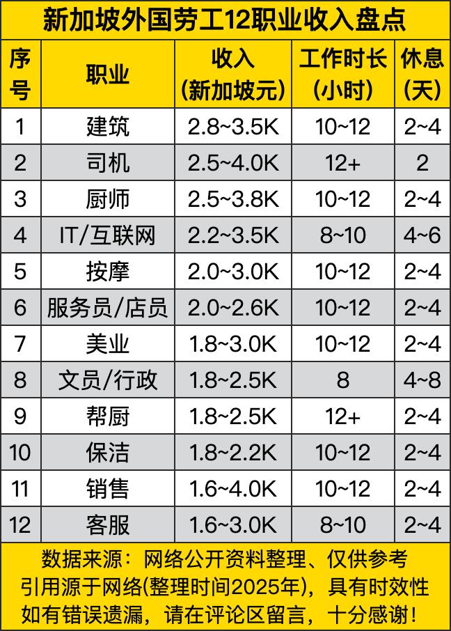 新加坡外国劳工这职业收入情况,那可真是让人感慨万千呐!这一个个职业看似是能赚钱的营生,实则背后藏着多少辛酸泪。就说这建筑、司机、厨师这些活儿吧,收入也就那么回事儿,从2.5K到4.0K新加坡元不等,但工作时间呢?动不动就是10小时往上,甚至12小时还带加号的,休息天数更是可怜巴巴,就2 - 4天。这哪是打工啊,简直就是拿命换钱,每天累得像条狗,就指望着这点收入改善生活,可谁知道这背后的付出有多大呀! 再看看按摩、服务员、美业这些行业,收入普遍在1.8K - 3.0K新加坡元,工作时间同样不轻松,10 - 12小时是常态,休息天数也和前面那些差不多。文员、行政相对工作时间短点,只有8小时,可收入也没高到哪儿去,在1.8K - 2.5K新加坡元。还有帮厨、保洁、销售、客服,收入基本都在2.0K以下,有的甚至才1.6K起步。 新加坡这地界儿,消费可不低,这些外国劳工赚着这点钱,除去生活开销,还能剩下多少呢?他们背井离乡来到这儿,就是想多挣点钱,给家人更好的生活,可这高强度的工作和并不丰厚的收入,实在是让人心酸。也不知道什么时候,他们的辛苦能得到更合理的回报,能让他们的日子过得舒坦点儿呢!咱就希望社会能多关注关注这些群体,让他们也能感受到点温暖和公平吧!