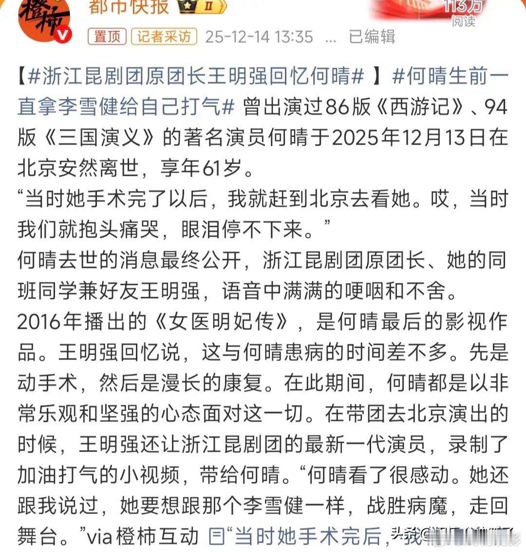 何晴患病期间照片曝光,简直判若两人,完全认不出来了!12月14日,据媒体报道,好友王明强晒出何晴患病期间的照片,此时做完手术,正在康复阶段,并透露两人抱头痛哭。看完照片,说实话,差点被吓了一跳,画面中,何晴留着短发,面容有些消瘦,变化有点大,简直判若两人,完全认不出来了。咱就说,这可是大家公认的古典第一美女,按理说,就算年纪大了,依旧难掩美貌和气质,由此可见,生病期间,压力不小。据王明强回忆,何晴表示要像李雪健老师一样,努力战胜病魔,重回舞台,可见内心非常坚强,热爱着演艺事业。此外,何晴还委托好友帮忙办理退休事宜,这……,作为路人,真的好难过,这个时候,估计认为自己一定会好起来吧!一位好演员,好母亲,就这样永远的离开了,让人感到惋惜!