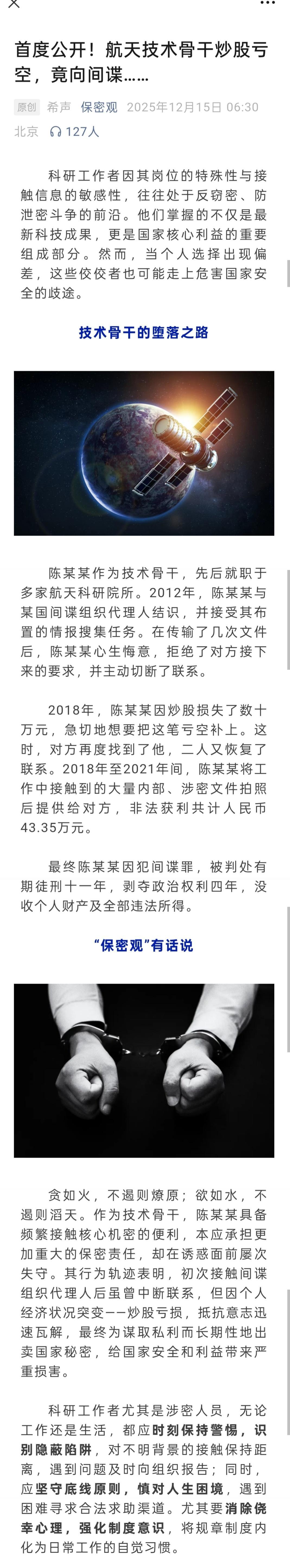 陈某某作为技术骨干,先后就职于多家航天科研院所。2018年至2021年间,陈某某将工作中接触到的大量内部、涉密文件拍照后提供给对方,非法获利共计人民币43.35万元。最终陈某某因犯间谍罪,被判处有期徒刑十一年。