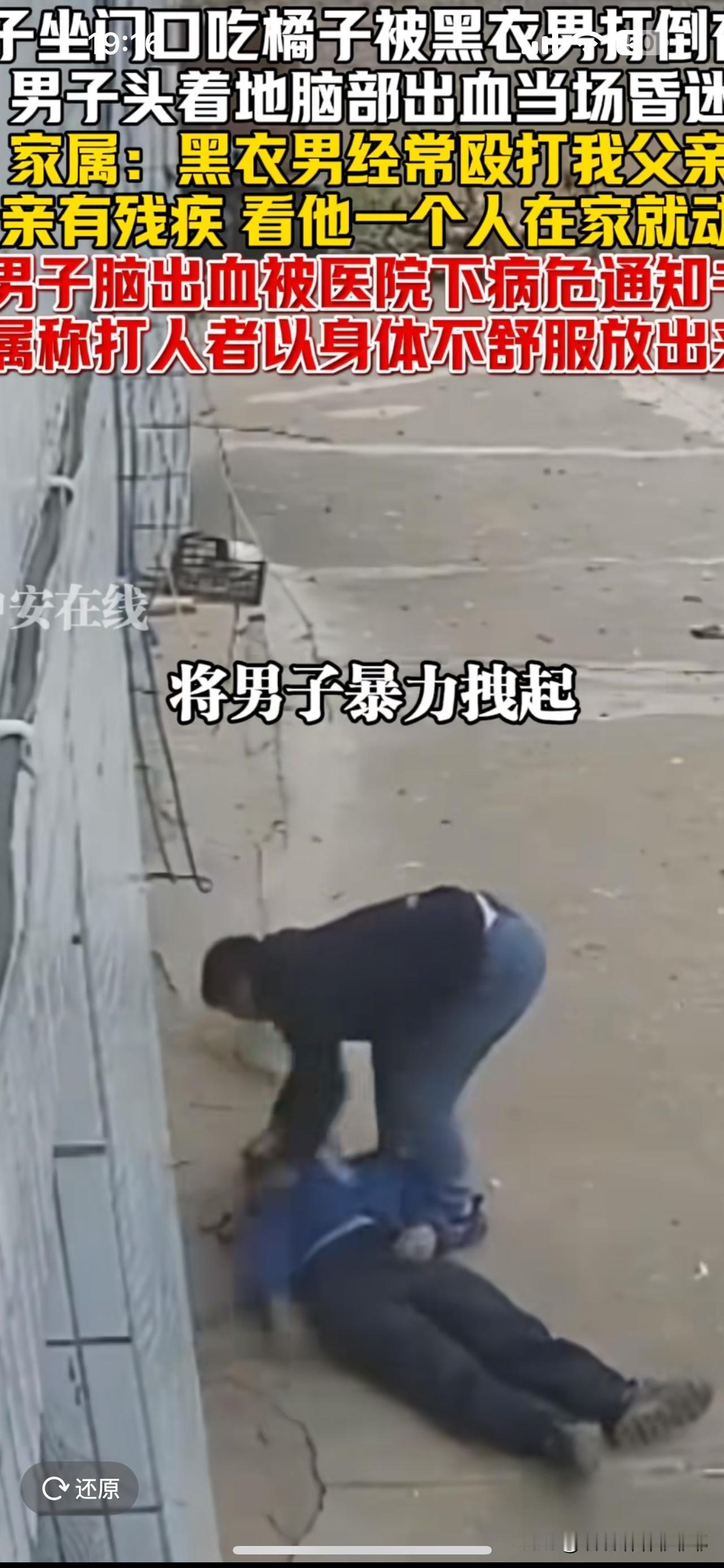 男子在家门口被邻居一拳打倒在地,打人者却因为身体不舒服被放了出来,这到底是怎么回事呢? 最新的官方通报来了,之前网传是一男子在家门口被邻居上门一拳打倒在地。事后被诊断为闭合性颅脑损伤,甚至还下发了病危通知书,但被打者家属却表示,打人者因为身体不舒服被放了出来,结果引起了很多人的质疑。 而根据江西宜丰警方的最新通报,这又变成了一起打架事件。双方因为养狗问题发生冲突,双方均有受伤,意味着不是殴打而是互殴。 但从网传的视频里我并没有看到互殴的场景,原视频一点剪辑都没有,从头到尾都是这个人一进来就把人打了,然后走了,没几分钟又回来了,发现没起来去扒了一下,发现有血才慌了! 希望官方能公布完整的视频画面。当然以打架事件来处理的话,给人放出来就能解释的通了。老百姓的关注是一种期盼,期盼看到彻底透明的调查,能理清这次殴打的来龙去脉, 芳溪镇派出所的叔叔们厉害,已经把人放了,还是学学呼和浩特吧,直接刑拘,这个人要是逍遥法外,简直是天理难容。