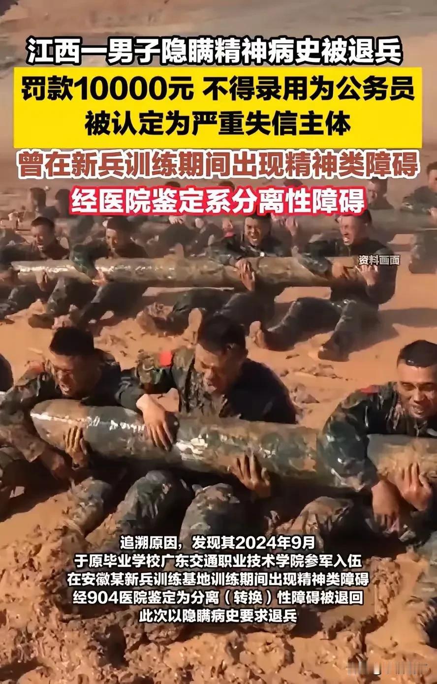 江西九江,一男子自愿报名参军,体检、政审和役前教育都顺利过关,成功进入部队。可就在部队为他办理军人保障卡时,系统却显示无法注册。一查才发现,这人原来是有“前科”的,这才知道他此前就因病被退回,而这一次就不止退回那么简单了,还被罚1万。 这名男子的操作,属实让人又气又不解——明明曾因病被部队退回,却揣着侥幸心理二次报名,一路闯过体检、政审和役前教育,眼看要再度穿上军装,最终还是栽在了军人保障卡的注册环节,不仅美梦破碎被退回,还被罚款1万元,这笔账亏得彻底,更藏着难以挽回的教训。 谁都知道,参军入伍从不是“想来就来、想走就走”的儿戏,每一道流程的审核,既是对部队战斗力的负责,也是对军人这份职业的敬畏。体检筛除健康隐患,政审核查过往履历,役前教育打磨思想意志,每一步都容不得半点隐瞒和糊弄。这名男子明知自己有被退回的经历,却刻意隐瞒,以为能蒙混过关,殊不知部队的审核系统早已织密一张网,任何心存侥幸的小动作,终究逃不过核查。 更值得深思的是,他的行为不只是浪费了部队的人力、物力资源,更辜负了社会对军人的期待。多少人挤破头想圆参军梦,为的是守护家国、扛起责任,这份荣誉沉甸甸,容不得半点亵渎。而他带着隐瞒的心思二次报名,本质上是对军人身份的不尊重,更是对规则的漠视。 1万元罚款不是目的,退回部队也只是后果之一,真正该让他记一辈子的,是“诚信”二字的分量,以及对军人职业的敬畏之心。军人肩上扛的是使命,心里装的是担当,连基本的诚信都做不到,又怎能扛起保家卫国的重任? 此事也给所有人提了醒:任何行业、任何岗位都容不下侥幸和隐瞒,规则面前人人平等,荣誉之下更要坚守底线。你觉得这种隐瞒过往二次参军的行为,罚得该不该?换作你,会对这份侥幸心理嗤之以鼻吗? 应征条件 征兵入伍体检 征兵体检政审