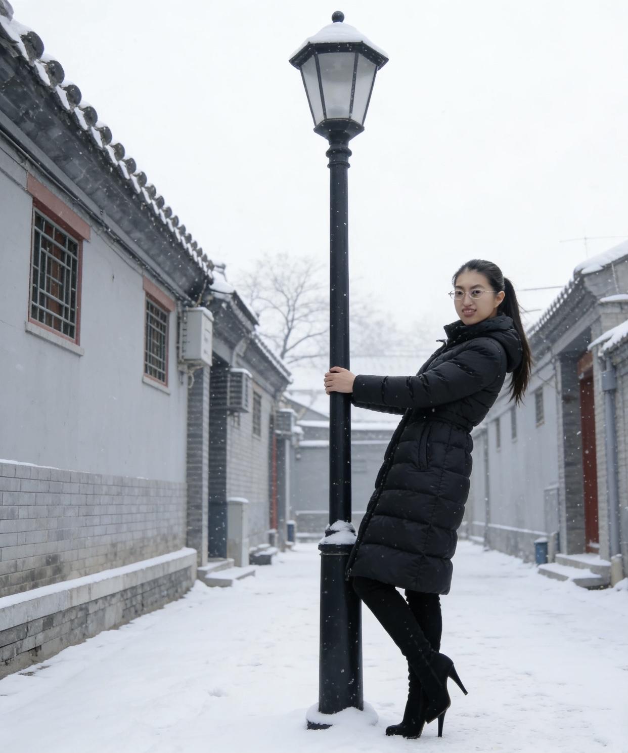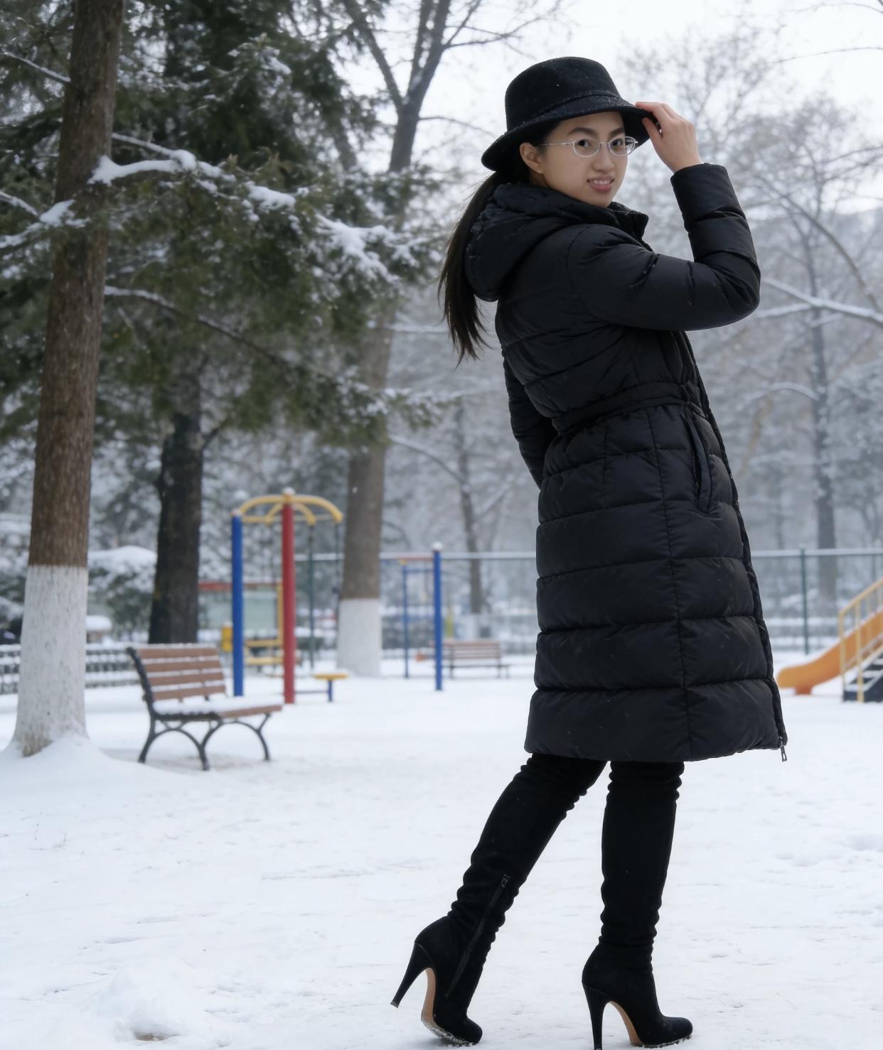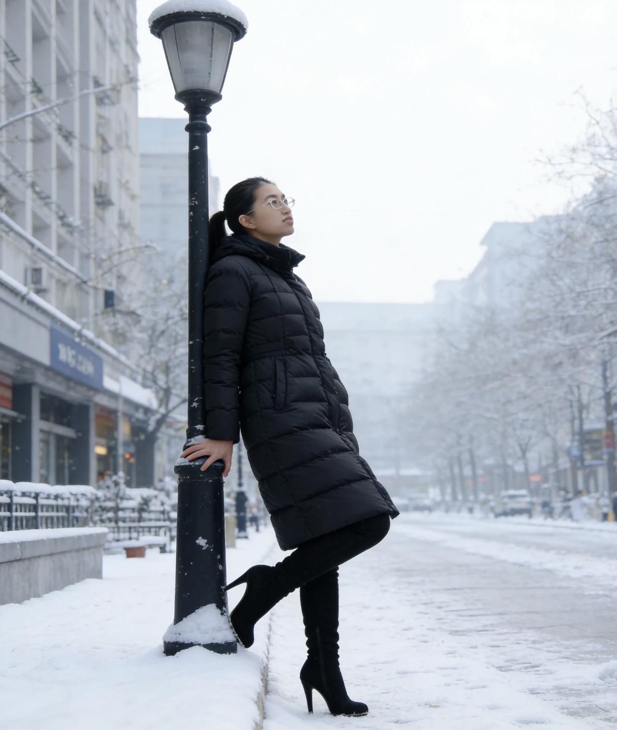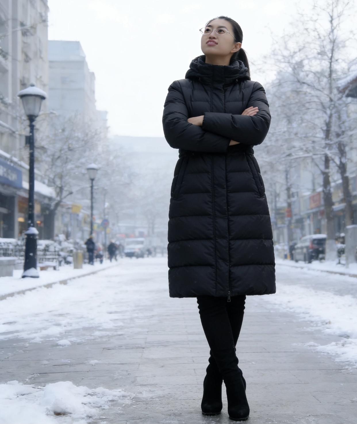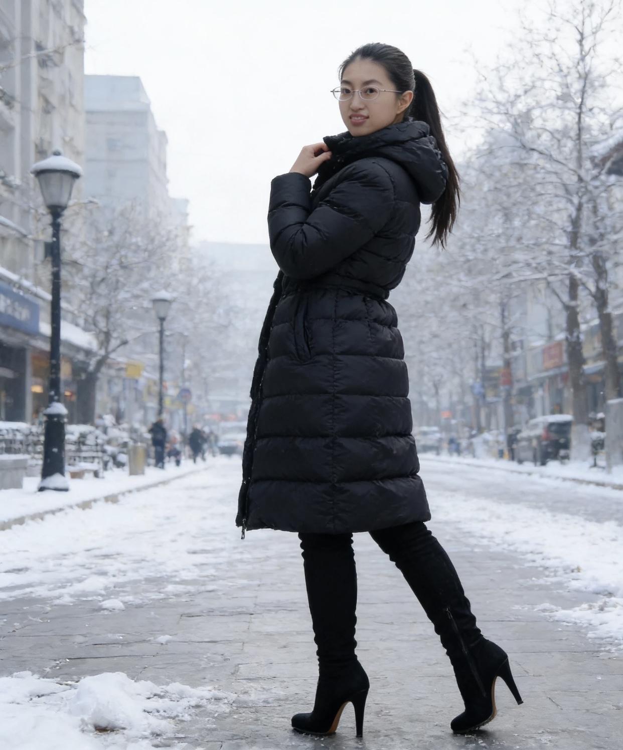 女生怎么穿紧身裤才好看冬日雪景中的时尚穿搭,黑色羽绒服搭配高跟靴,优雅而温暖。