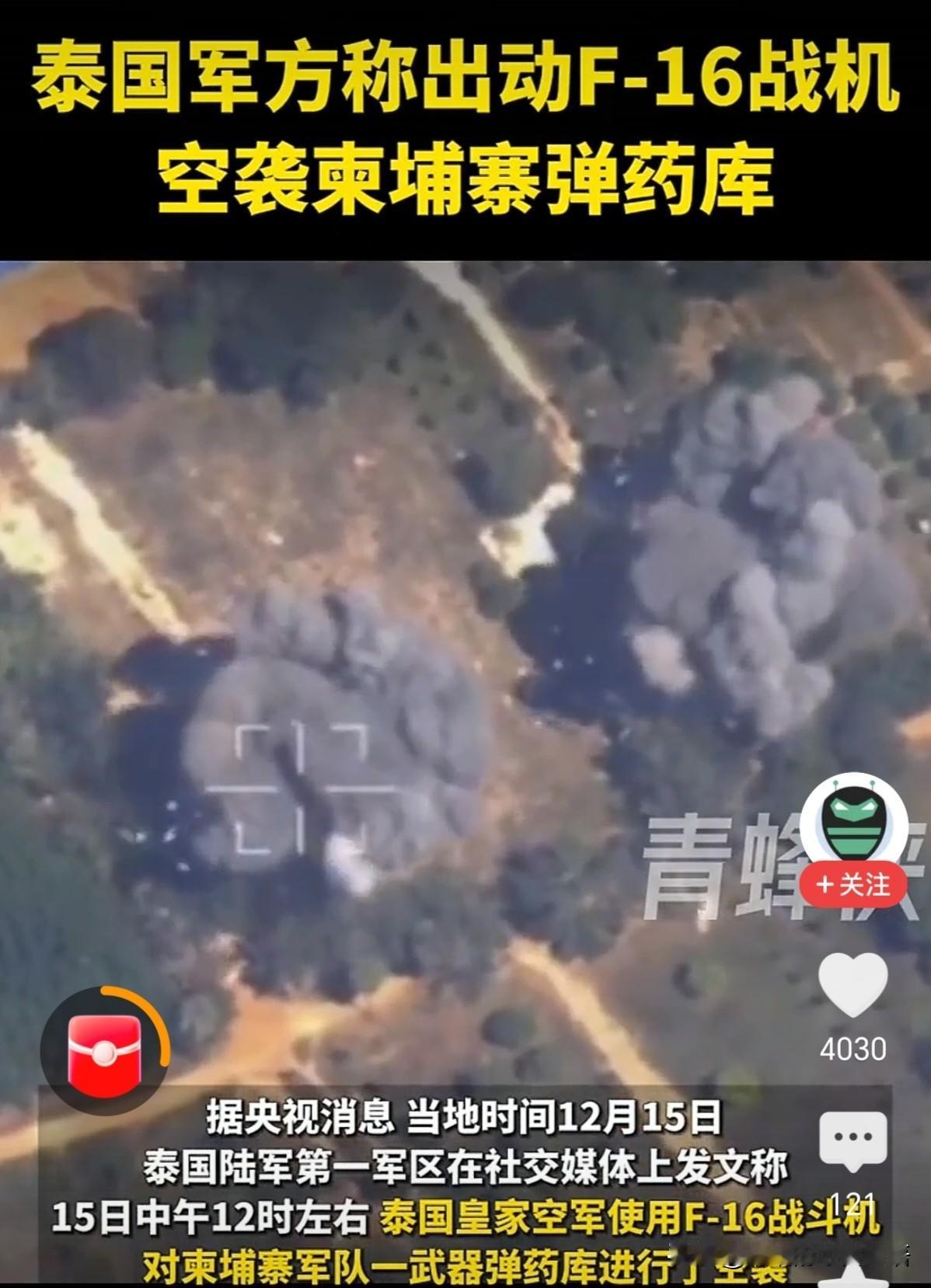 泰国打诈铲赌,赢了战场得了人心。 泰国军方直取柬埔寨命门,F一16袭击柬埔寨军火库画面,两团蘑菇云腾空而起,军火库瞬间被夷为平地。 失去弹药支撑的柬埔寨拿什么打?但现在无论柬埔寨有多惨,都无人同情!