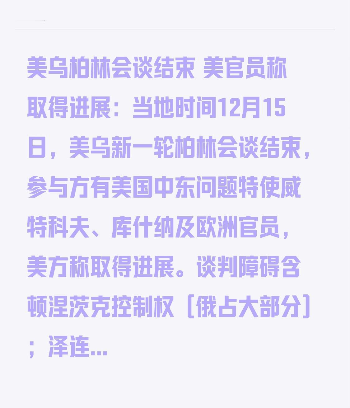美乌柏林会谈结束 美官员称取得进展:当地时间12月15日,美乌新一轮柏林会谈结束,参与方有美国中东问题特使威特科夫、库什纳及欧洲官员,美方称取得进展。谈判障碍含顿涅茨克控制权(俄占大部分);泽连斯基希望入北约但美欧反对,同意接受类北约第五条安全保障;俄坚持乌放弃入北约、从乌控顿涅茨克部分撤军为和平关键,期待美方通报情况,拒绝对时间表预测。