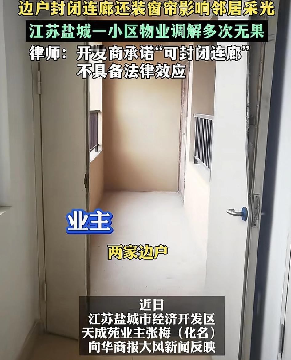江苏盐城一小区业主称他们的户型是连廊的,但是两边的边户把连廊围起来做自己的私人领地,装上了防盗门,还装上窗帘,影响了自己的采光,多次给物业反映,但是物业称自己没有执法期间,已经上报到社区街道等等,但是也等不到明确的答复。而且当时开发商宣传楼盘的时候,口头承诺边户可以封连廊。但是我们购买连廊房型的时候,都知道连廊的作用就是为了让高层的用户在遇到紧急情况可以迅速逃生。这样把连廊封住,肯定是不符合消防和城建安全的。