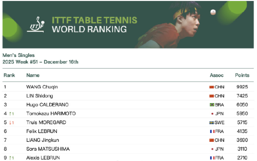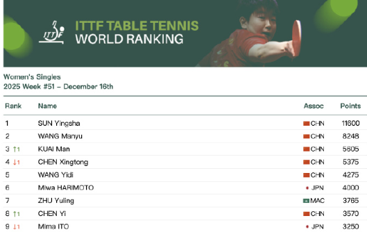 12月16日,世界乒联公布2025年第51周排名。女单方面,孙颖莎11600分连续第179周霸榜第一,王曼昱8248分排名第二,蒯曼5605分排名第三。男单方面,王楚钦9925分排名第一,林诗栋7425分排名第二,雨果6050分排名第三。