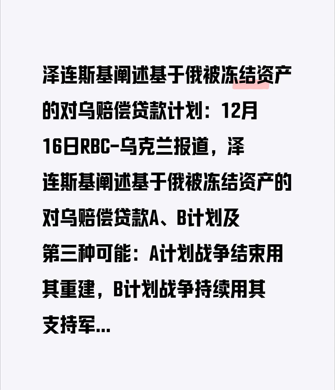 泽连斯基阐述基于俄被冻结资产的对乌赔偿贷款计划:12月16日RBC-乌克兰报道,泽连斯基阐述基于俄被冻结资产的对乌赔偿贷款A、B计划及第三种可能:A计划战争结束用其重建,B计划战争持续用其支持军队和国防;若无法获得,正与欧盟谈替代融资。欧盟1400亿欧元贷款遭比利时阻挠(要求自主担保),欧盟有2026年初过渡性贷款备用方案。