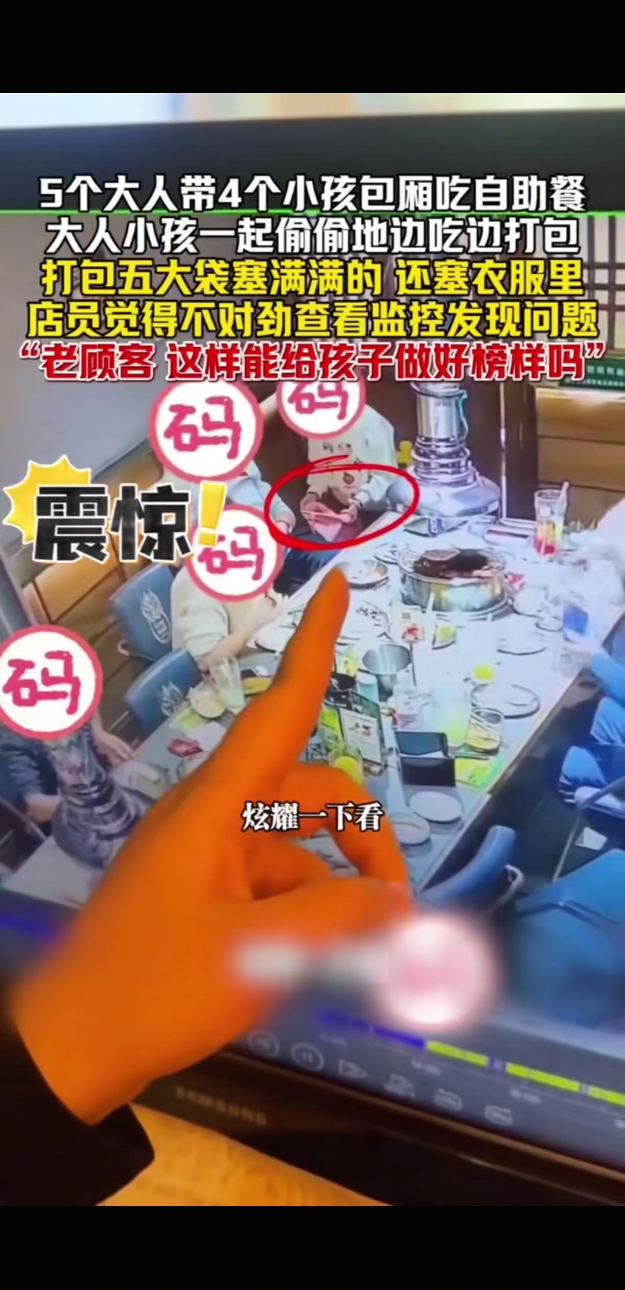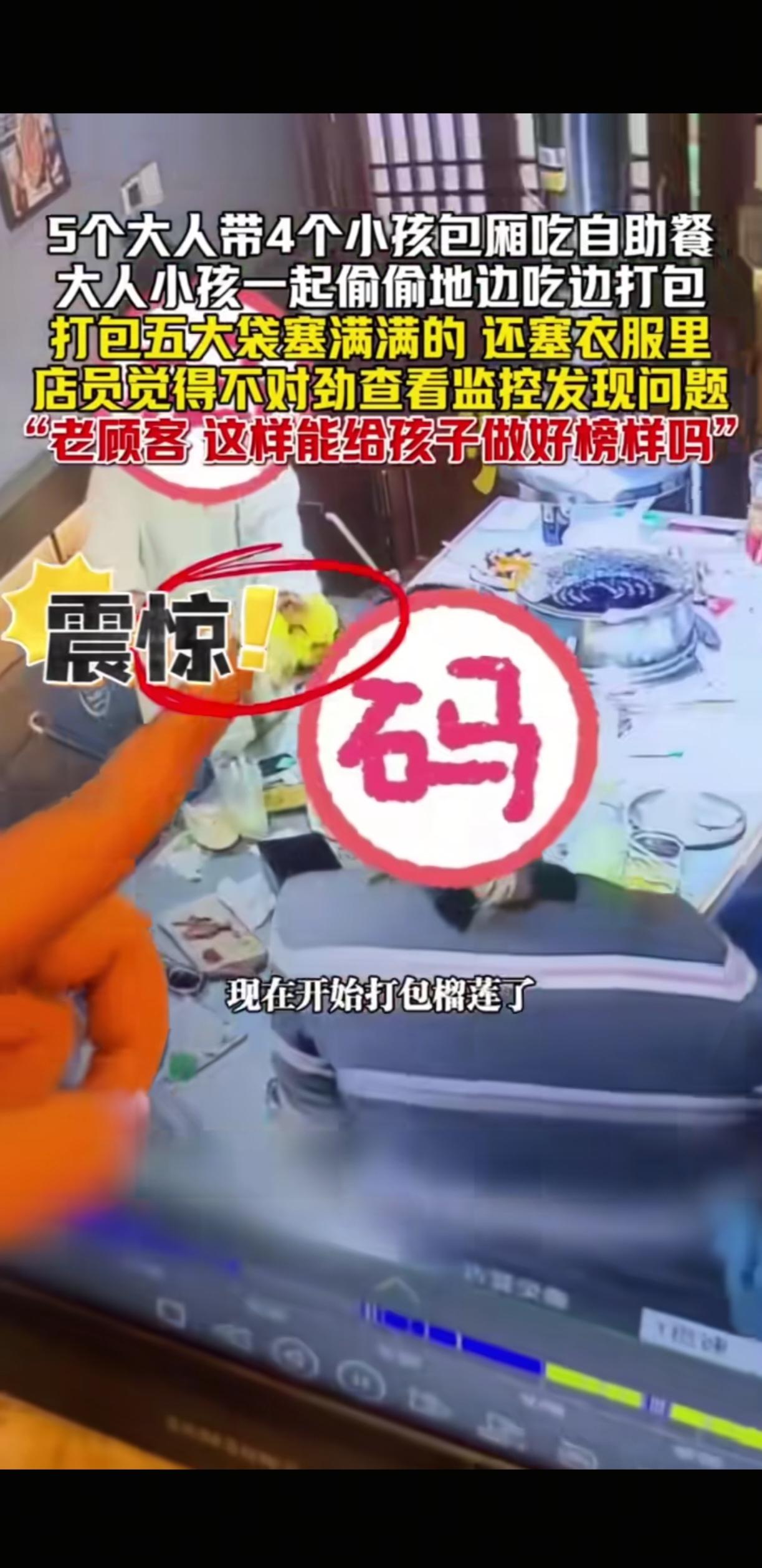 新疆乌鲁木齐,5个大人带4个孩子吃自助,店员发现他们单子上竟有41份榴莲,肉、海鲜类也都是十份起点。店员发现不对,调取监控后发现,这9人竟然一边吃一边打包,偷偷带走了满满五大袋子食材。 这伙人一进包厢就直奔监控死角,外套都没脱就开始观察环境,一看就是“惯犯”。刚开始他们带的袋子都是扁扁的,可吃到后面,袋子全被塞得鼓鼓囊囊。他们不光装食材,连店里的饮料也没放过,还让孩子帮忙拿包、装东西,大人在一旁只顾着往包里、衣服里塞,甚至把食材裹在羽绒服里,满满装了五大包。 用餐时,他们全程不让服务员收盘子、换烤盘,就怕被发现猫腻。店家发现点单量异常后,调出监控才看清这一系列操作。当店员上前要求他们为打包的食材付费时,几人还理直气壮,说自助餐付了钱就可以随便吃,打包点剩的没什么不对,指责店员小题大做。直到店家拿出“禁止外带”的告示,还表示要报警处理,他们才慌了神,最终不情不愿地补了钱,抱着袋子匆匆离开。 这事在网上传开后,大家议论纷纷。有人觉得这家人太没素质,吃自助还打包,简直是占便宜没够。也有人觉得店家标价不低,吃不完打包也不算大事。而店家更生气的是,这几人还是老顾客,竟然当着4个孩子的面做这种事,给孩子树立了坏榜样。自助餐厅的规矩,到底是该靠食客自觉,还是靠店家严格管控,成了大家争论的焦点。 各位读者你们怎么看?欢迎在评论区讨论。 来源:百姓家常事 2025-12-15发布