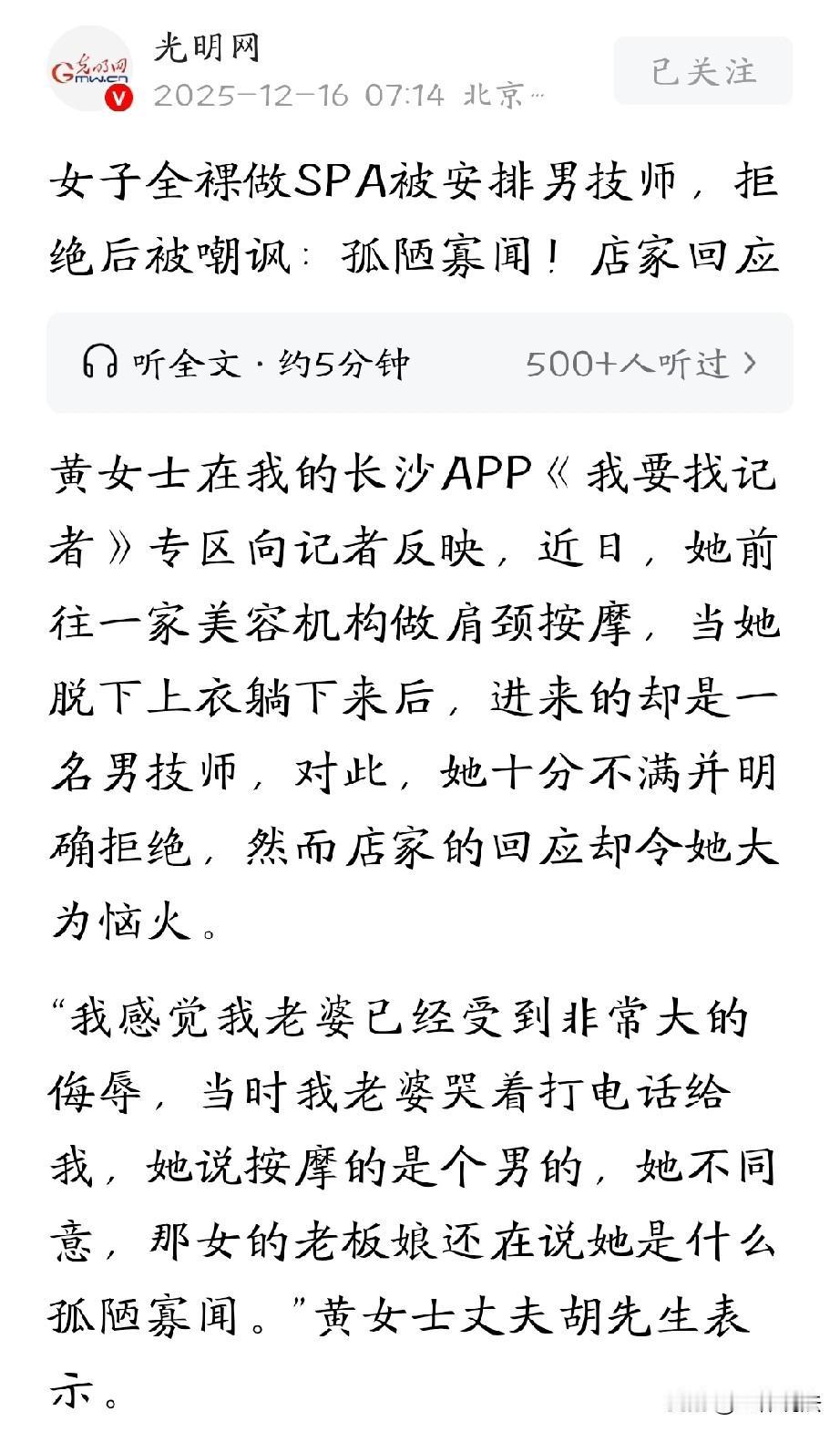 “是我孤陋寡闻?”湖南长沙,女子到美容馆做肩颈按摩,她脱完上衣躺下后,却走进来一名男技师,准备为她服务。女子惊了,自己上半身全裸,绝对接受不了这种事情,于是,果断拒绝。万万没想到,店长竟然讽刺女子是孤陋寡闻,大惊小怪,还说男技师都能当她儿子了,对她能有什么想法。这些话让女子备受侮辱,钱她能不要,但店长必须给她道歉。 黄女士为了养生,在一家美肤中心专门办了会员,可万万没想到,一次消费,不但没让她放松,反倒惹了一肚子气。 12月12日,她像往常一样前往这家店,打算做个肩颈按摩项目。 到了店里,黄女士按照正常流程开始做护理。她先把上半身的衣服脱掉,然后趴在了按摩床上,准备好好享受一下,缓解全身的疲劳。 很快,一个女店长走了进来,轻轻给她盖上了一块小毛巾,黄女士就安安静静地趴着。 紧接着,她听到又有人进来了,站在了自己旁边,她觉得应该是技师,便没有多想。 可万万没想到,等店长说完话,旁边传来一声“好”,这一声可怕黄女士吓坏了,因为这是个男性的声音。 她当时就懵了,自己上半身没穿衣服,怎么就进来了一个男技师,自己也无法接受男性来服务。 于是,她明确提出拒绝,希望换个女技师来。 女店长一听,有点不以为然,还反问黄女士:你怎么不能接受男性啊? 黄女士又羞又恼,表示自己上半身全裸,就是接受不了男技师,而且这家店没有问自己的意愿,就冒昧的安排一个男技师,很不尊重人。 可万万没想到,女店长接下来的话,让黄女士感觉受到了极大的侮辱。 女店长居然说:不要这么孤陋寡闻,去医院也有男的医生,去洗个脚也有男的呢。 黄女士瞬间气炸,虽然男技师并没有直接触碰到自己的身体,但未经她同意就进入按摩房,这本身就是一种冒犯,到头来还说自己小题大做。 她强忍着怒火,明确要求店长给她道歉,款可以不退,钱可以不要,这口气她咽不下。 谁知,店长的语出更加惊人,她竟然表示,那个男孩子长得标标致致,20来岁,看不上黄女士,他都可以做她儿子了之类的话。 黄女士赶紧到赤露露的侮辱,马上给丈夫胡先生打去了电话。 电话里,她带着哭腔把事情的经过跟丈夫说了一遍,胡先生一听,也火了,立刻赶到了门店。 一到店里,丈夫就质问店长:你错了没有? 可女店长一直觉得自己没有错,还振振有词地说:这种情况是司空见惯的,很正常的,男的给女的按,女的给男的按。 胡先生听了,更生气了,他觉得,即使是按摩,起码你要问一下女性,要尊重她接不接受这样的服务,并不是所有人都能接受这种事情。 双方各执一词,胡先生将此事反映给了记者,随后,记者跟着黄女士夫妇再次来到了涉事门店。 记者一到,就向店长询问事情的经过。 店长一脸无所谓地表示,他们是正规的按摩,有男士,也有女士。黄女士并没告诉提前告知,说不让男技师做,所以他们就随便安排,男女技师都有。 而且,顾客全程身上盖着被子和毛巾,技师跟她没有额外的身体接触。 况且,当时顾客说不让男技师做,我说给她安排女的,谁知她二话不说,非要报警。 没办法,我就说把钱退给她,她以后也不用来了,我们干了11年了,最讲诚信,从不强留客户。 听了店长的描述,黄女士气得浑身发抖,店长太会避重就轻了,对自己的言语侮辱,只字未提。 对此店长却反驳,说她没说过那些污蔑的话,只说20岁的小伙子都赶上自己儿子了,而且自己本人也在里头,他不可能把顾客怎么着。 双方为此争执不下,闹得不可开交,为了不影响正常营业,其他工作人员赶紧过来劝解。 《消费者权益保护法》第9条规定:消费者享有自主选择商品或者服务的权利。 肩颈按摩涉及上身裸露,属于高度私密服务场景,顾客对技师性别有合理选择权。 美肤中心在黄女士未同意的情况下安排男技师,直接剥夺其对服务提供者性别的选择权,违反该条“自主决定接受服务”的核心要求,构成对自主选择权的侵害。 此外, 《消费者权益保护法》第14条规定:消费者在购买、使用商品和接受服务时,享有人格尊严、民族风俗习惯得到尊重的权利,享有个人信息依法得到保护的权利。 黄女士明确拒绝男技师后,店长以“孤陋寡闻”等言语指责,并以“男技师看不上你”等言论羞辱,属于公然贬低、损害其人格尊严的行为。 即便服务中盖有毛巾,也不能免除经营者尊重顾客人格尊严的法定义务,该言论已构成对人格尊严权的侵犯。 黄女士有权请求其承担停止侵害、赔礼道歉、赔偿精神损害等民事责任 。 好在,在大家的劝说下,最后店长给黄女士道了歉,黄女士丈夫胡先生也觉得自己先前的言行有些过激,也向店长道了歉,此事才得以平息。