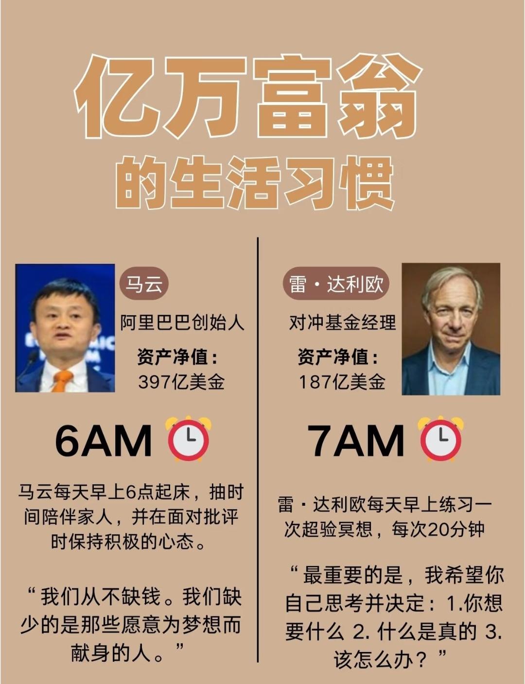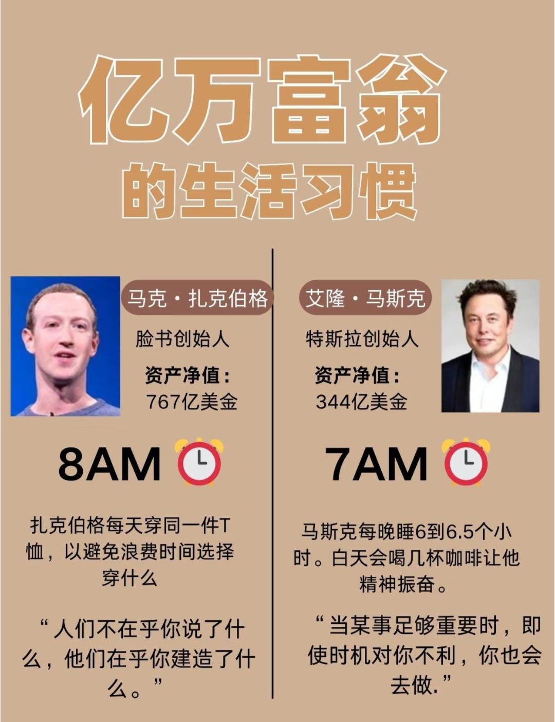 活该他们是亿万身价! 说到亿万富翁的生活习惯,很多人第一反应可能是“奢华”、“随心所欲”。天天都是晒晒太阳喝喝咖啡,但根据对数百位白手起家的富翁(包括马斯克、巴菲特、库克等)的研究和观察,真相确是出人意料。 他们中的大多数并不把时间花在享受物质上,而是极度自律,甚至有些枯燥。以下我为你总结了亿万富翁们最普遍的几大核心习惯: 🌅 1. 极度推崇“早起”与“独处时间” 大多数亿万富翁不是被闹钟吵醒的,而是被目标唤醒的。 提前开工: 很多人(如马斯克、库克)会在清晨5:30甚至更早就起床。他们利用工作开始前的几个小时进行“深度工作”。 掌控感: 这段时间没有电话、没有邮件打扰,他们可以用来规划一天最重要的三件事,或者进行高强度的思考。这种“独处时间”能让他们一整天都感到对生活有掌控力。 📚 2. 持续学习与阅读 巴菲特曾说,他的职业准备方式就是每天阅读500页。富翁们把阅读当作获取知识的工具,而非娱乐。 阅读类型: 偏爱历史、传记、自我提升类书籍。 输入习惯: 无论是比尔·盖茨还是马斯克,都是“贪婪的读者”。他们通过阅读来获取跨领域的知识,激发创新思维。 💪 3. 像“苦行僧”一样的健康习惯 虽然他们有钱享受一切,但在健康上往往非常“抠门”或自律。 规律运动: 研究显示,76%的富人每天会进行至少30分钟的有氧运动(跑步、游泳、快走)。这不仅是为了身材,更是为了保持大脑的高效运转。 极简饮食: 很多富翁(如扎克伯格、马斯克)的饮食非常单调。马斯克早餐常吃牛排鸡蛋,甚至开玩笑说如果只能吃一种食物那就是“芝士汉堡”。这种简化是为了减少决策疲劳,把脑力留给更重要的事。 ⏳ 4. 极致的时间管理与工作狂模式 时间块管理: 像马斯克那样,把一天切成5分钟的时间块,极度精确地安排任务。 长时工作: 这是一个残酷的现实:大多数白手起家的富翁每周工作80-100小时。他们信奉“工作与生活的平衡”不如“工作与生活的融合”,把工作本身视为一种创造和乐趣。 🤝 5. “向上社交”与心态管理 圈子决定高度: 你常往来的5个人的平均值,就是你的身价。富翁们倾向于结交目标明确、乐观热情的人,远离“负能量黑洞”。 寻找导师: 他们善于寻找比自己更成功的人做导师,吸取经验。 积极心态: 几乎所有的自力更生富翁都保持着积极乐观的态度,他们把失败看作反馈,而不是终点。 💰 6. 独特的财富观:节俭与多元收入 这可能是最反直觉的一点:很多亿万富翁在生活中非常节俭。 朴素生活: 比如巴菲特住在几十年前买的老房子里,宜家创始人开旧车、住经济型酒店。 不依赖单一收入: 65%的富翁在赚到第一个100万之前,就已经有了至少3种收入来源(如投资、副业、版权等)。 其实我们不需要像马斯克那样把自己逼到极限,但可以借鉴其中的核心逻辑: 1. 把时间花在“增值”而非“消磨”上。 2. 建立早起的“独处仪式”(哪怕只有15分钟),用来阅读或规划,这会让你的一天截然不同。 3. 保持身体的健康,这是所有财富的基石。