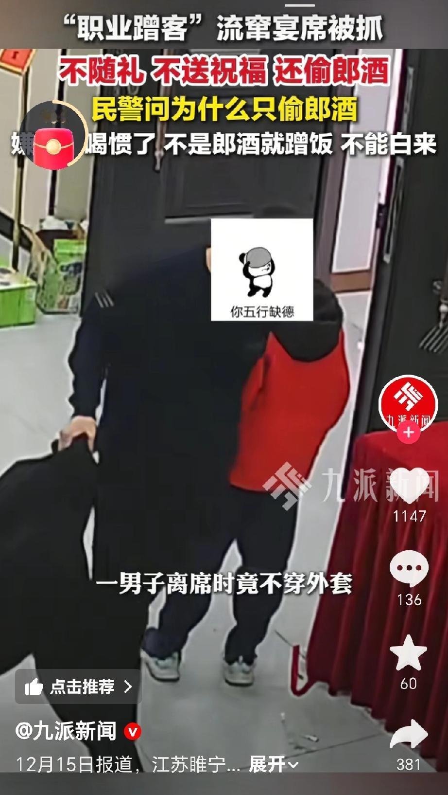 1“职业蹭客”流窜宴席盗窃郎酒被抓近日江苏睢宁县张女士一家在酒店办婚宴,宴席结束清点物品时,发现两瓶红花郎白酒不翼而飞。报警后民警调取视频发现,寒冬时节一男子离席时不穿外套、神色匆匆快步下楼,经查该男子并非宾客,而是长期流窜于各类宴席的“职业蹭客”兼盗窃惯犯。该男子若发现宴席用郎酒就盗窃,若不是就蹭饭,他向民警解释是“喝惯了,不是郎酒就蹭饭,不能白来”。该男子被处行政拘留8日的处罚。(来源于@九派新闻)