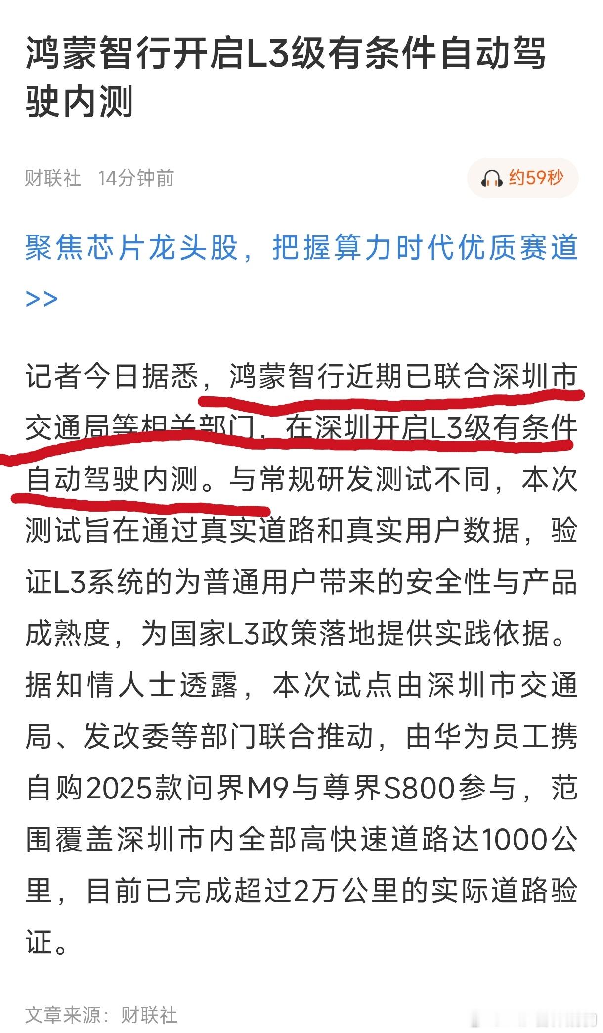 因为这个信息【鸿蒙智行近期已联合深圳市交通局等相关部门,在深圳开启L3级有条件自动驾驶内测】所以,$赛力斯 sh601127$ 股票爆拉?