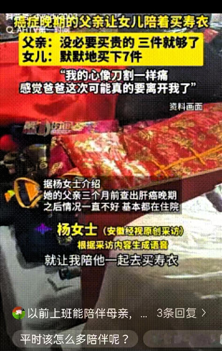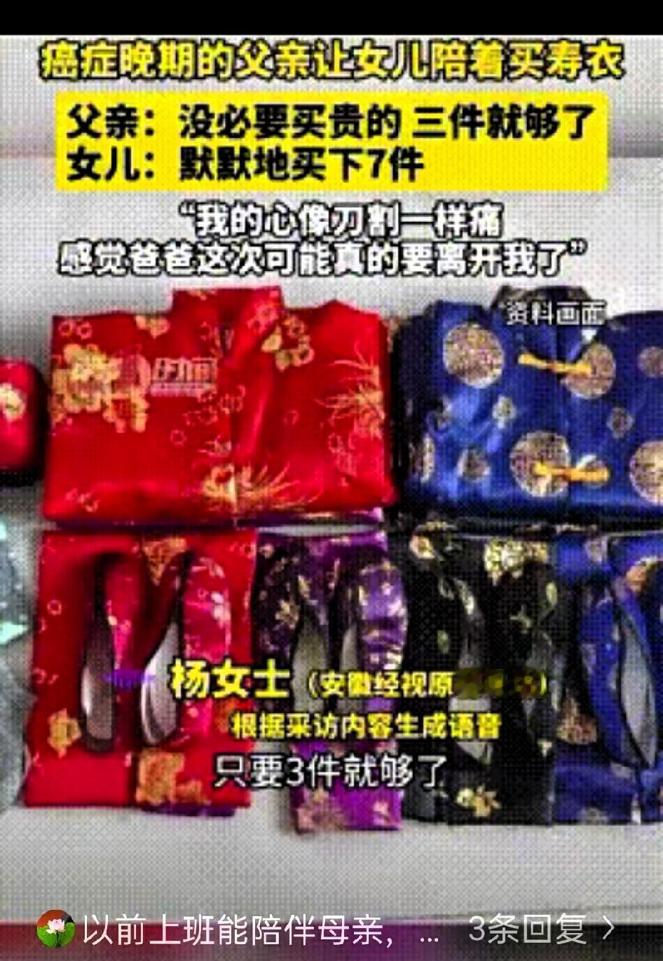 泪目!重庆一位父亲确诊肝癌晚期三个月,身体日渐虚弱,多数时间在医院度过,疼痛难忍时只能靠止痛针缓解。某天打完针精神稍好,他提出让女儿陪自己去买寿衣,女儿虽心里难受,还是默默陪同前往。 到了寿衣店,父亲轻声叮嘱女儿,不用买贵的,三件就足够。他知道自己时日无多,不想给女儿多添开销,还絮叨着身后事要从简,埋在哪里、不用麻烦亲戚等琐事,每一句都透着对女儿的体谅。 女儿看着父亲瘦得脱相、只剩皮包骨的模样,满心酸涩,趁父亲选好尺码,悄悄跟店家交代打包七件。 回家的路不算长,女儿搀扶着父亲,却觉得格外漫长。曾经能扛起整个家的宽厚臂膀,如今轻得让人心疼,父亲的每一句叮嘱,都像重锤敲在她心上,她忍着哽咽轻声回应,怕哭出来让父亲牵挂。 这段时间照料父亲,她早已清楚生命在倒计时,可当父亲直面后事安排,那份不舍与心痛还是难以抑制。 我们总以为父母会一直陪伴,总把尽孝的事推到以后,却忘了生命从没有来日方长。父母的爱从来都藏在细节里,哪怕到了最后时刻,惦记的还是子女的难处。孝顺从不是等出来的,也不用多么轰轰烈烈,多一次陪伴、一顿家常饭、一句关心,都是对他们最好的回馈。 别等失去后才追悔莫及,趁父母还在,好好珍惜相处的时光,别让爱留下遗憾