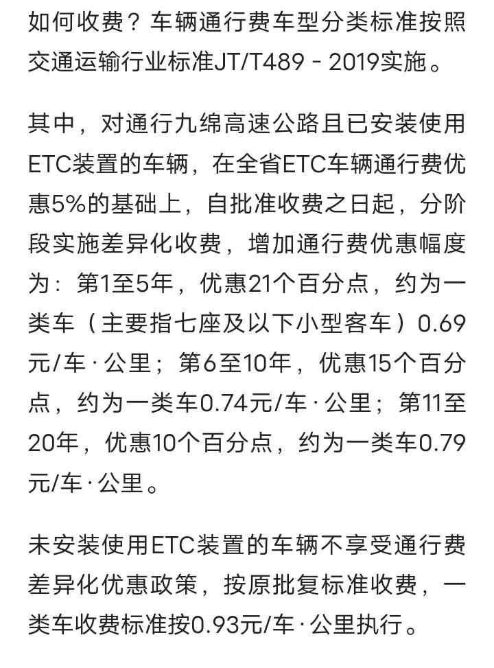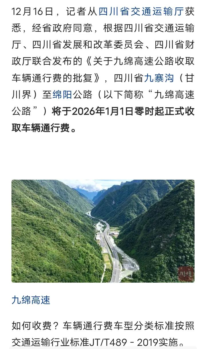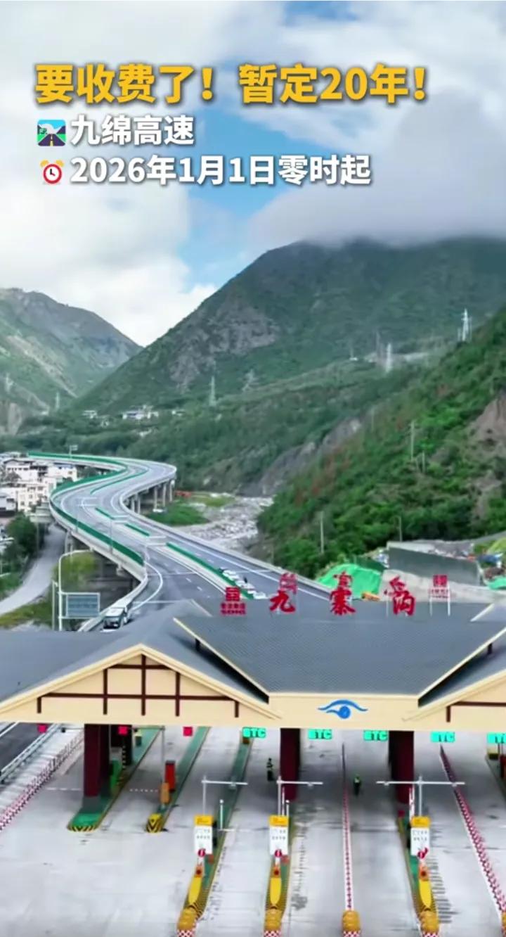 阿坝九寨沟至绵阳的九绵高速即将于2026年1月1日开通收取通行费,小客车0.93元每公里,ETC车辆优惠21%后约为0.69元每公里,相比汉蓉高速成都至绵阳段约1元每公里还是稍微便宜一点,全长约240公里的九绵高速全线开通将成都开车来往就寨沟的通行时间缩短至4个多小时,相比走213国道茂县和松潘段节省不少时间,南充和德阳等地来往平武和九寨沟也非常方便了,喜欢旅行的朋友可以趁着最后的免费时间去游玩一下平武和九寨沟的,九绵高速收费期限暂定为20年,信息仅供参考,具体收费标准以实际为准。