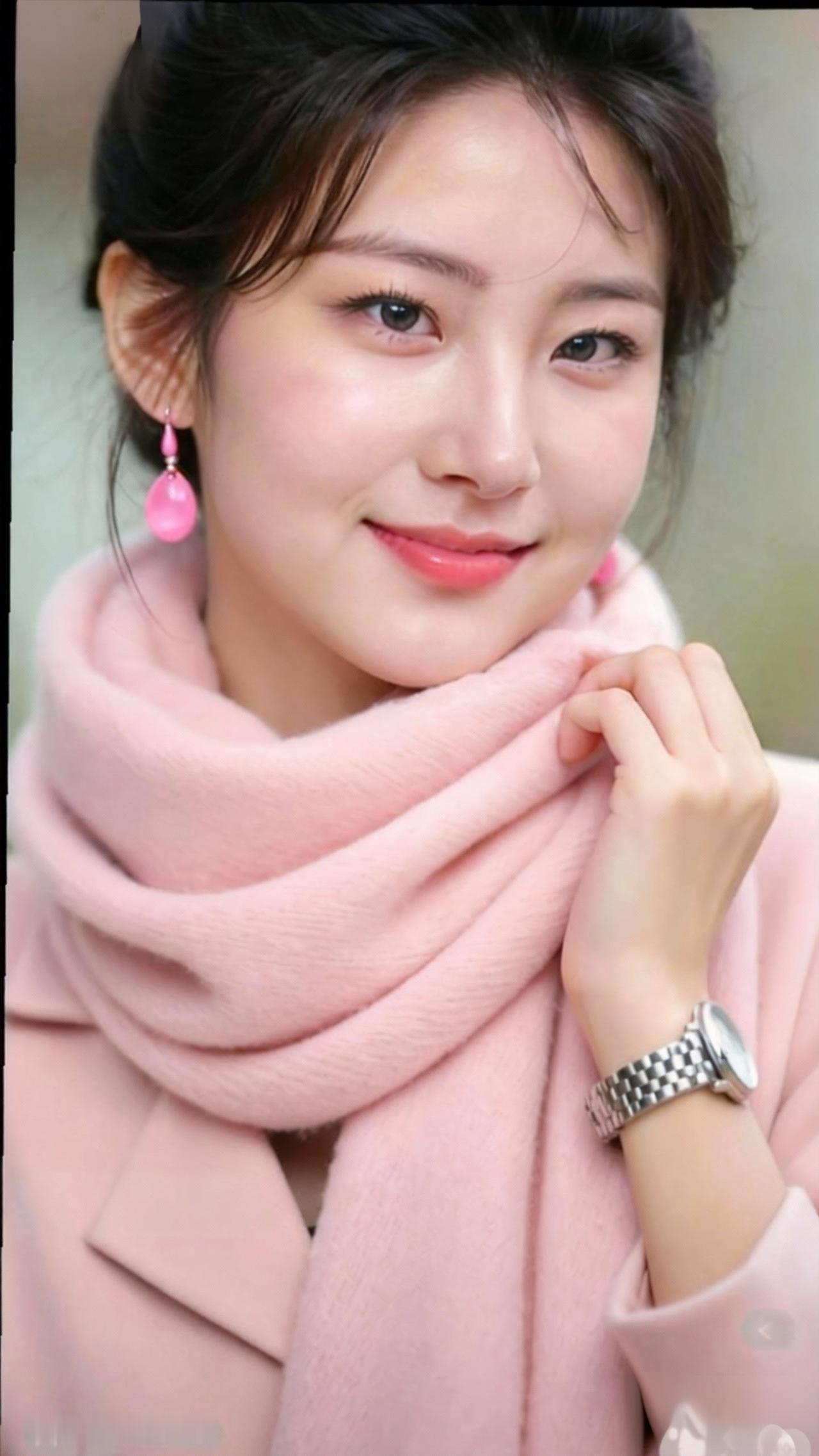 温柔粉嫩,甜美可人,粉色耳环与围巾相得益彰,尽显少女心。