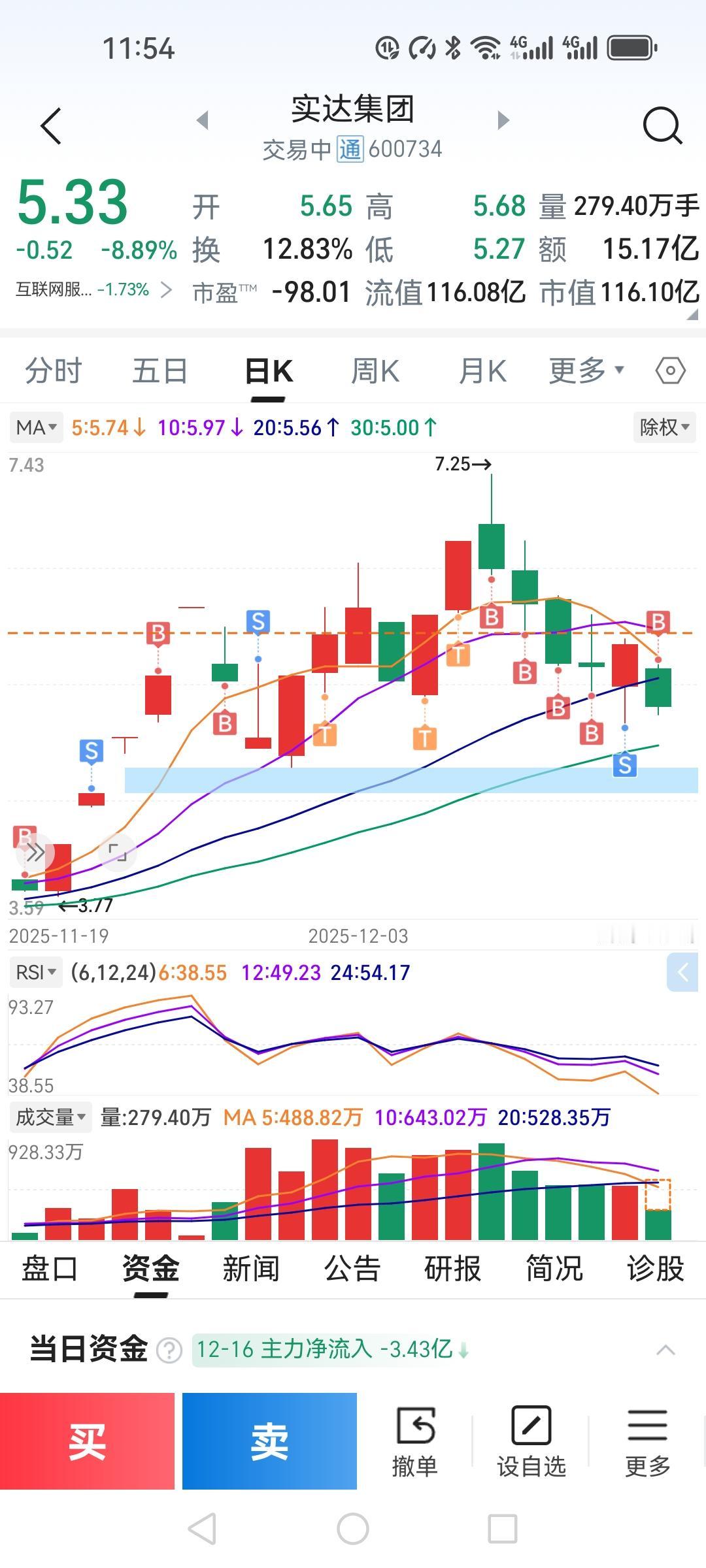 预判实达集团今天可能跌停,却没管住手。 今早盯着实达集团,开盘直接挂单,它却在5.4横盘不动,像被施了魔法。以往总在十点前出手,今天特意多等了等,眼看股价纹丝不动,以为到底了,撤了5.27改挂5.41——成交瞬间,直线下坠,跌停板毫不留情。 中午收盘定格在5.33。又一次,买在了半山腰。明明可以再等等,为什么总是急着伸手?股市里,耐心才是唯一的护身符,可我总忘了带。 今天这个气让我的小心脏很不舒服,恨自己为什么随便改变计划,这不是自找苦吃吗?不说了,说了全是泪。
